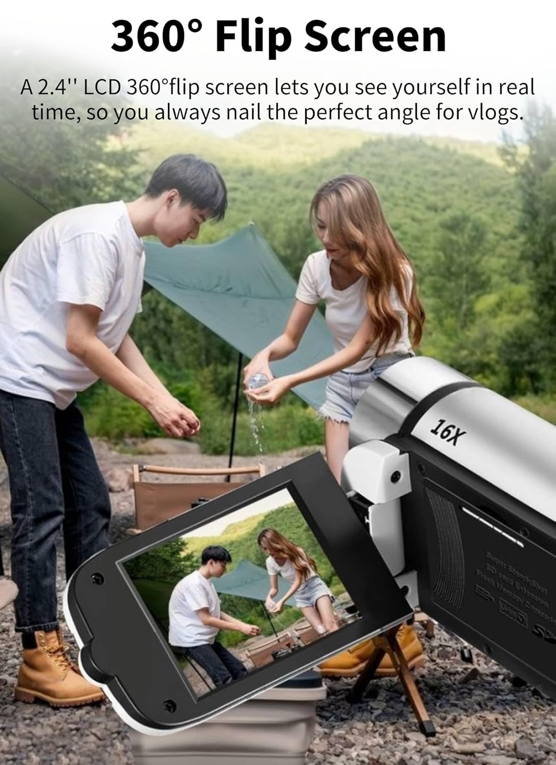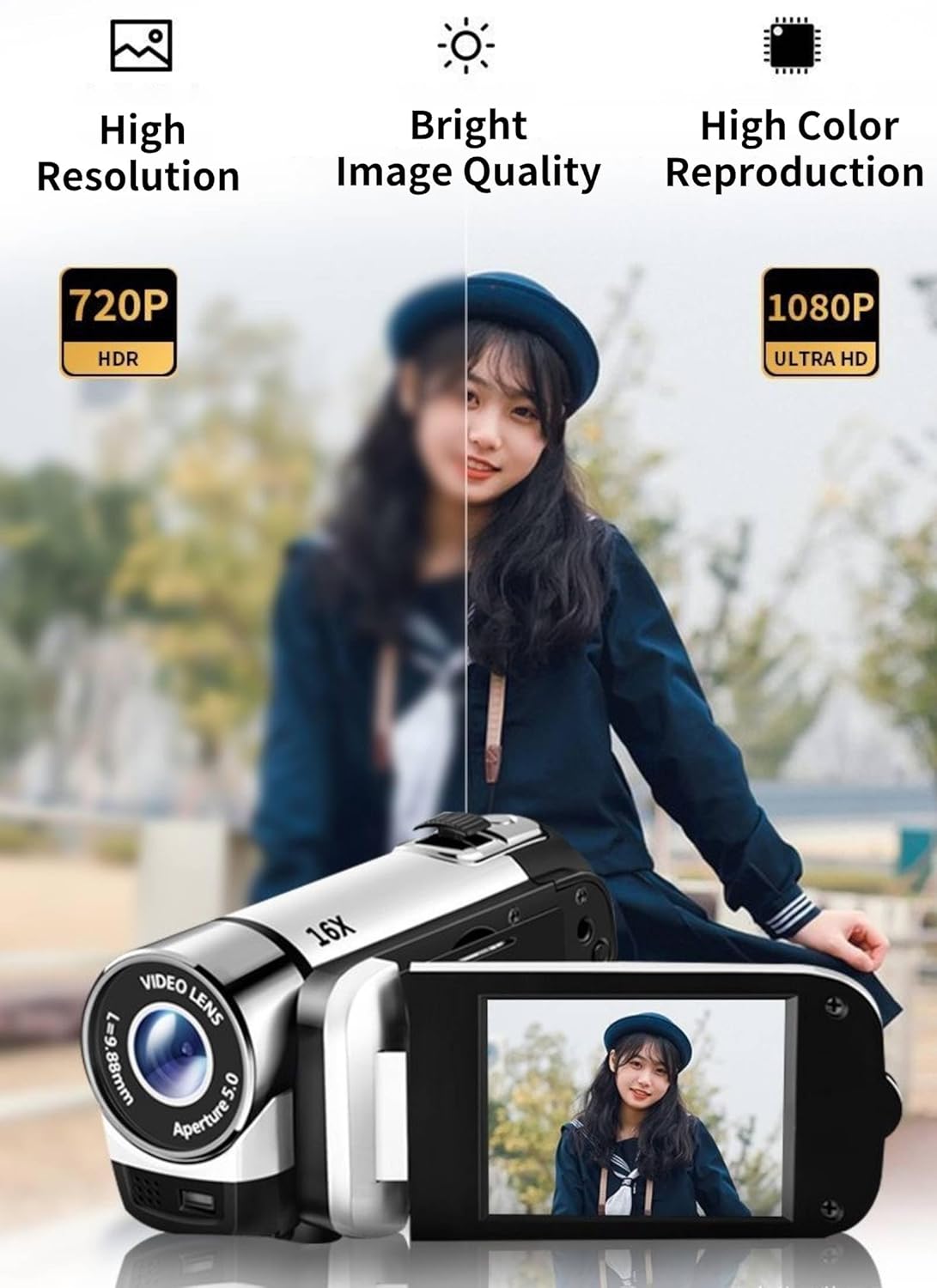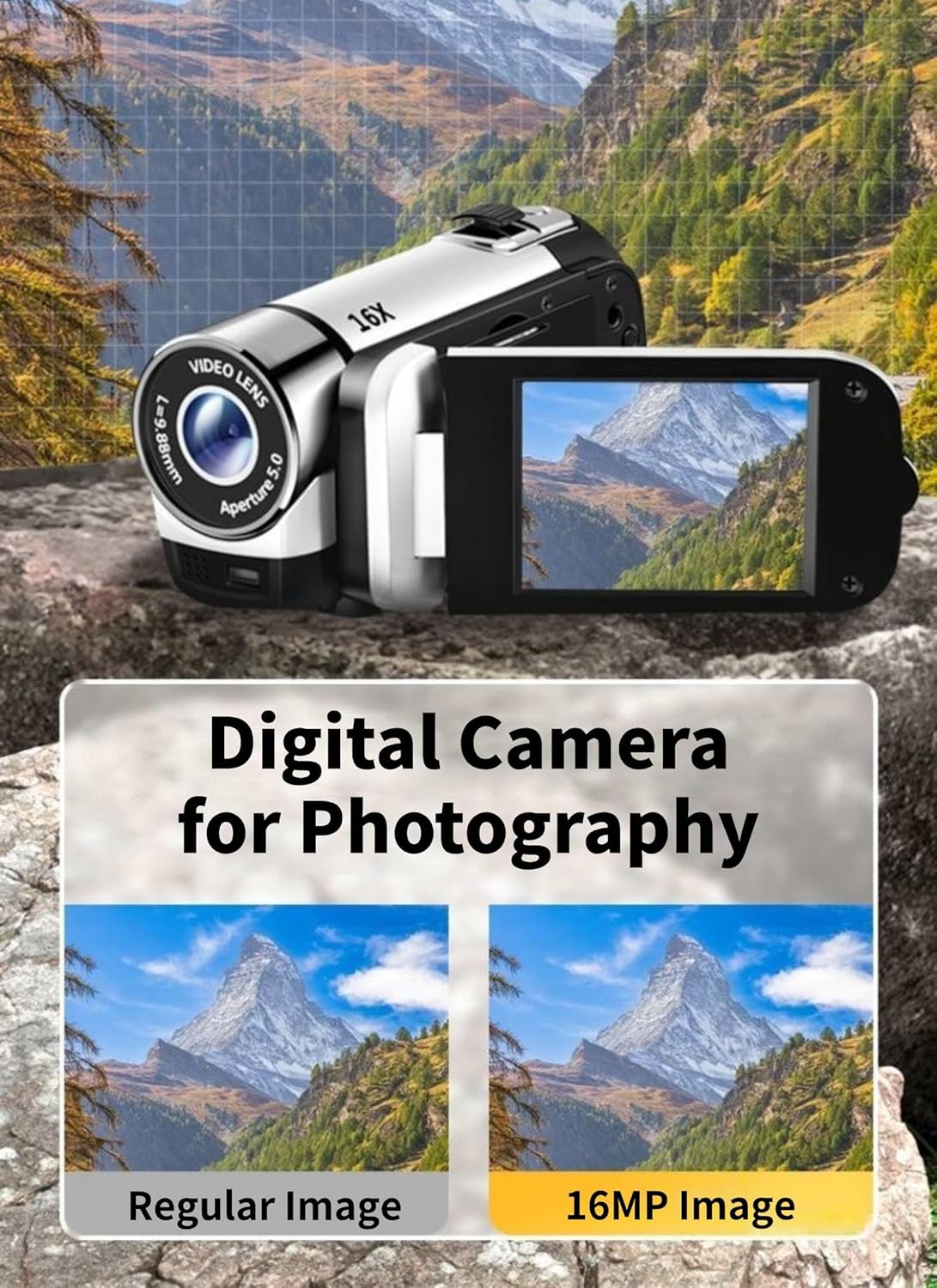 【Camera Parameter】: This digital camera has 2.4 inch rotatable screen, 1080P video resolution, 16X digital zoom, 16MP pixels, HD output, supports recording while charging.