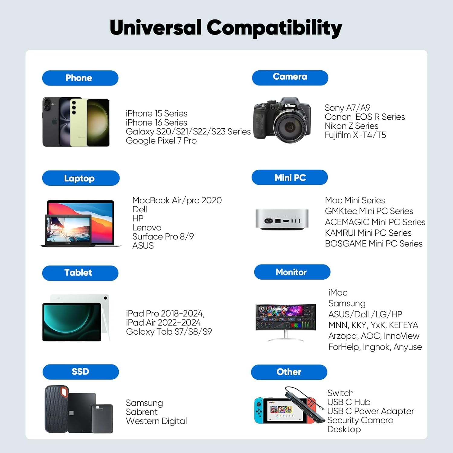 Universal Fit: Compatible with Type-C devices including MacBook, iPad, Dell XPS, Samsung, and more.