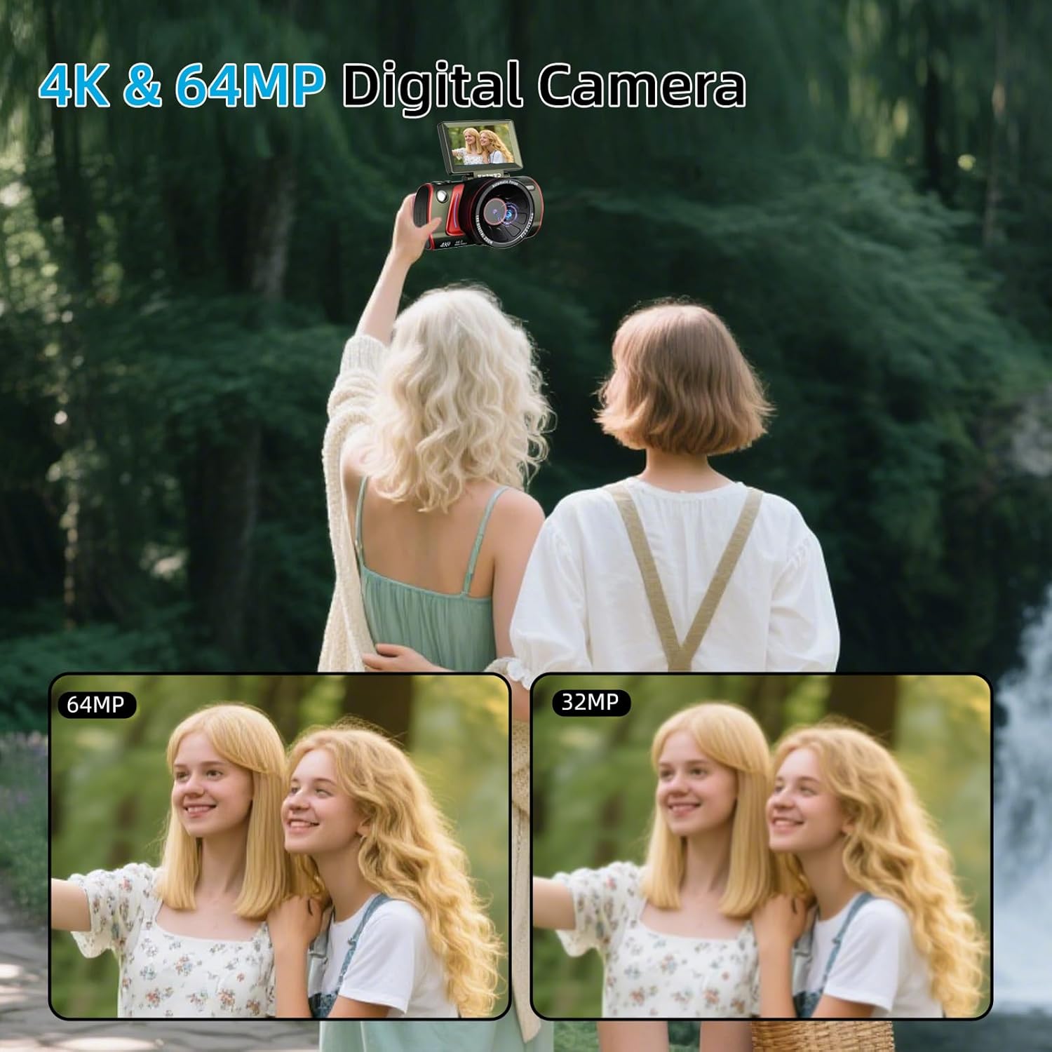 4K Digital Camera with Flip Screen:Equipped with 4K ultra-high-definition video and 64-megapixel high resolution, it features a 3-inch 180° flip screen for easier selfies. Intelligent autofocus accurately locks onto the subject for clear and sharp detail capture.