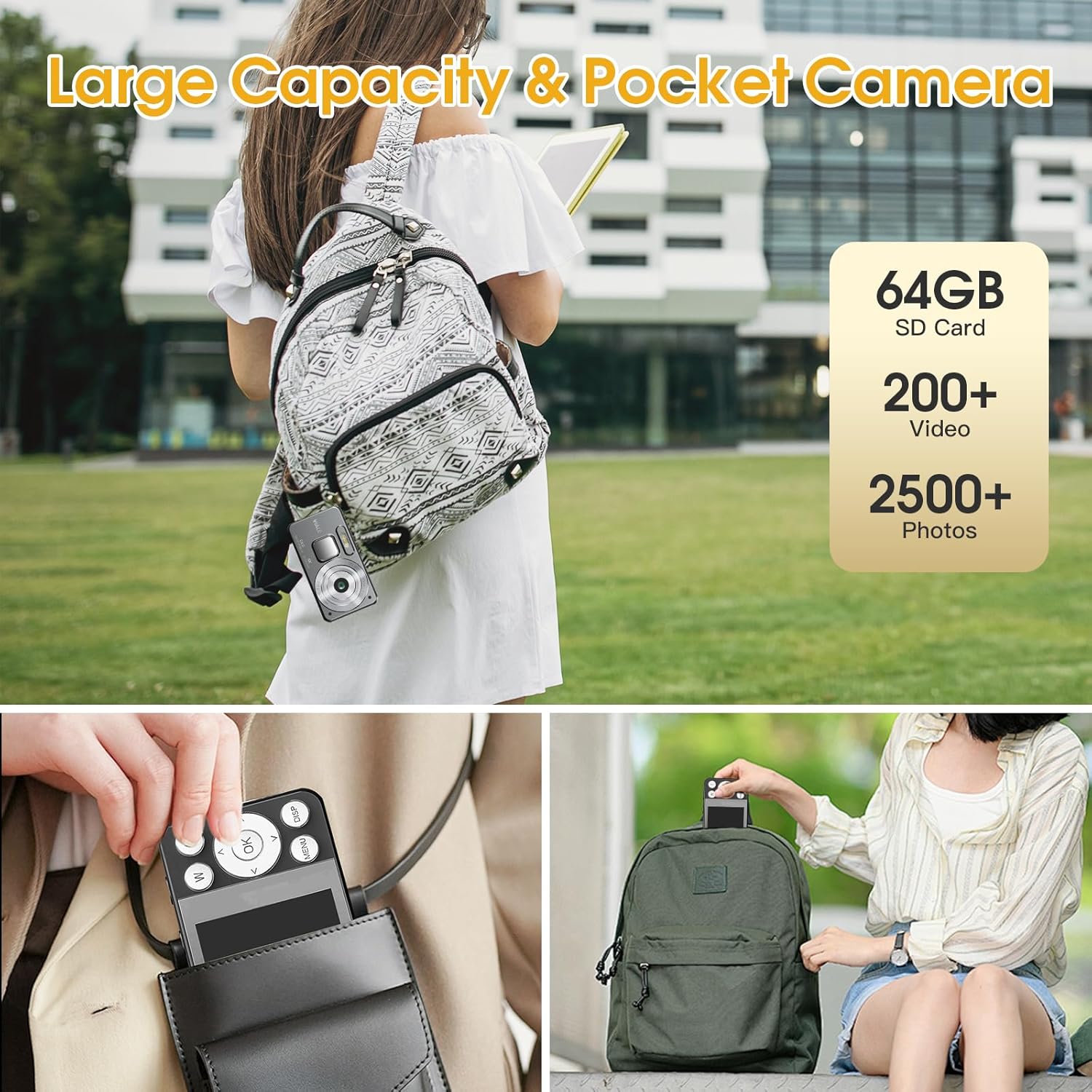 4K Digital Camera for Teens, FHD 64MP Digital Camera for Kids with 64GB SD Card, 18X Digital Zoom Cameras for Photography, Point and Shoot Video Camera for Kids, Black