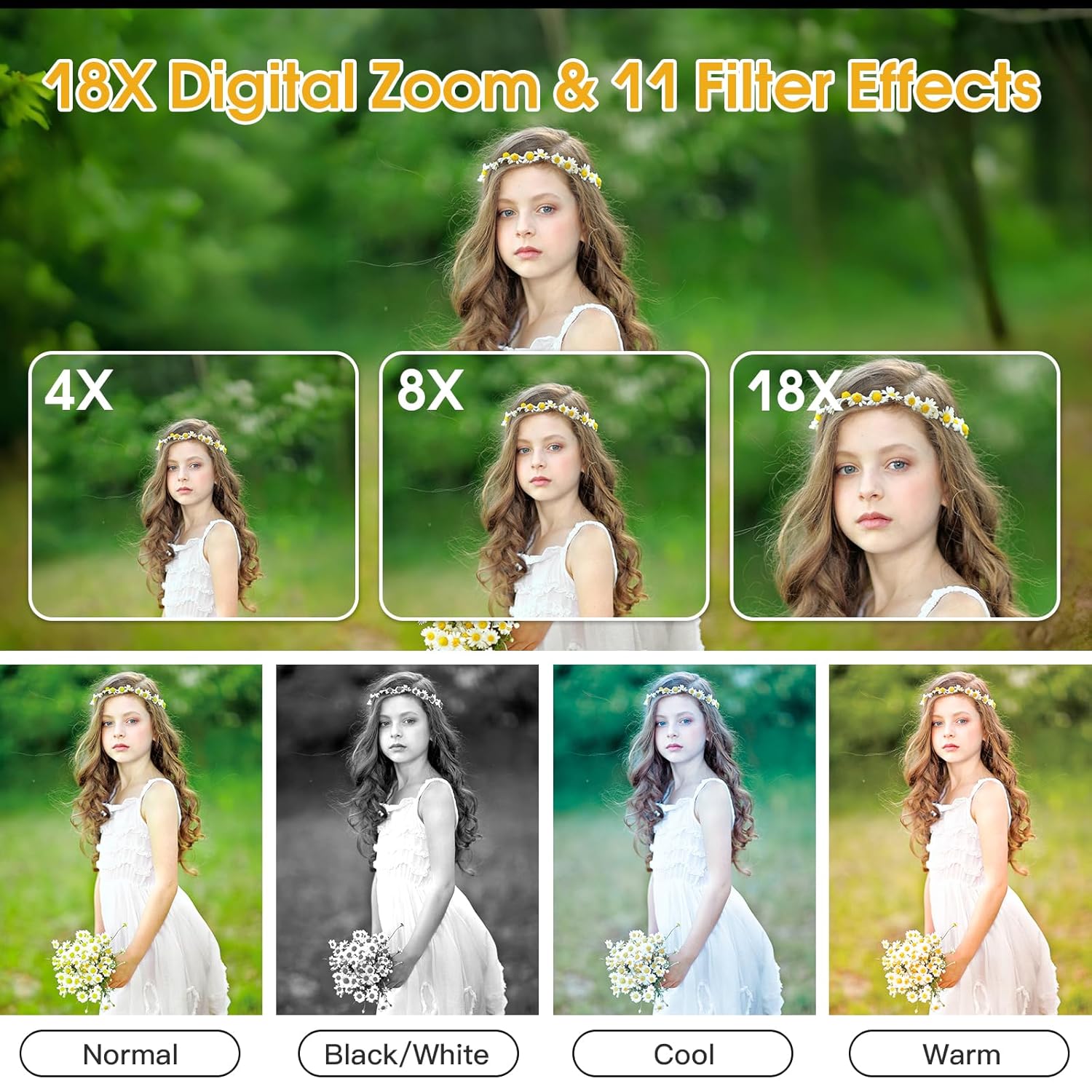 【Autofocus & 18X Digital Zoom】The vlogging camera features an innovative autofocus function, it can capture sharp images quickly, ensuring that they are no longer blurry or out of focus. Support 18x digital zoom, perfect for shooting distant objects, clearly capture what you want and you never miss every beautiful moment.