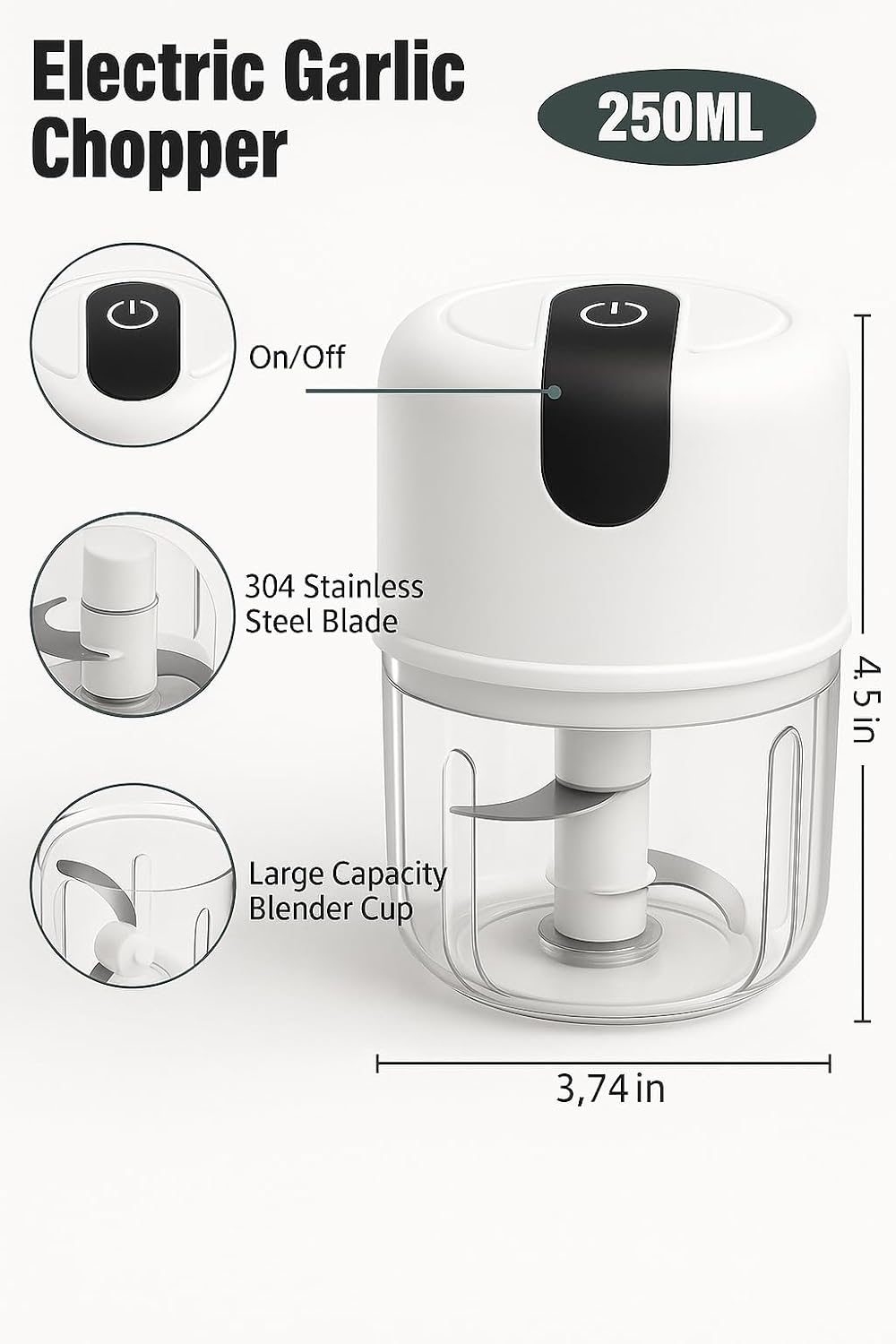 Konquer TimeS Mini Electric Garlic Chopper – Portable Wireless Food Processor with Stainless Steel Blades, Rechargeable Grinder for Onion, Ginger, Chili, Meat, Fruit, Vegetables, etc – 250ml (White)