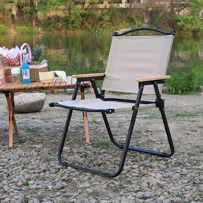 Comfortable Seating Experience: Wide seat with breathable khaki fabric and supportive backrest ensures relaxed posture and comfort for long hours under the sun or stars.