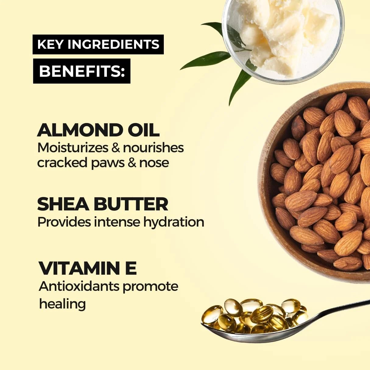 Nourishes and softens the paw pads: Shea Butter, Coconut Oil, and Almond Oil deeply moisturise and nourish the paw pads, promoting healthier, smoother, and more resilient paws.