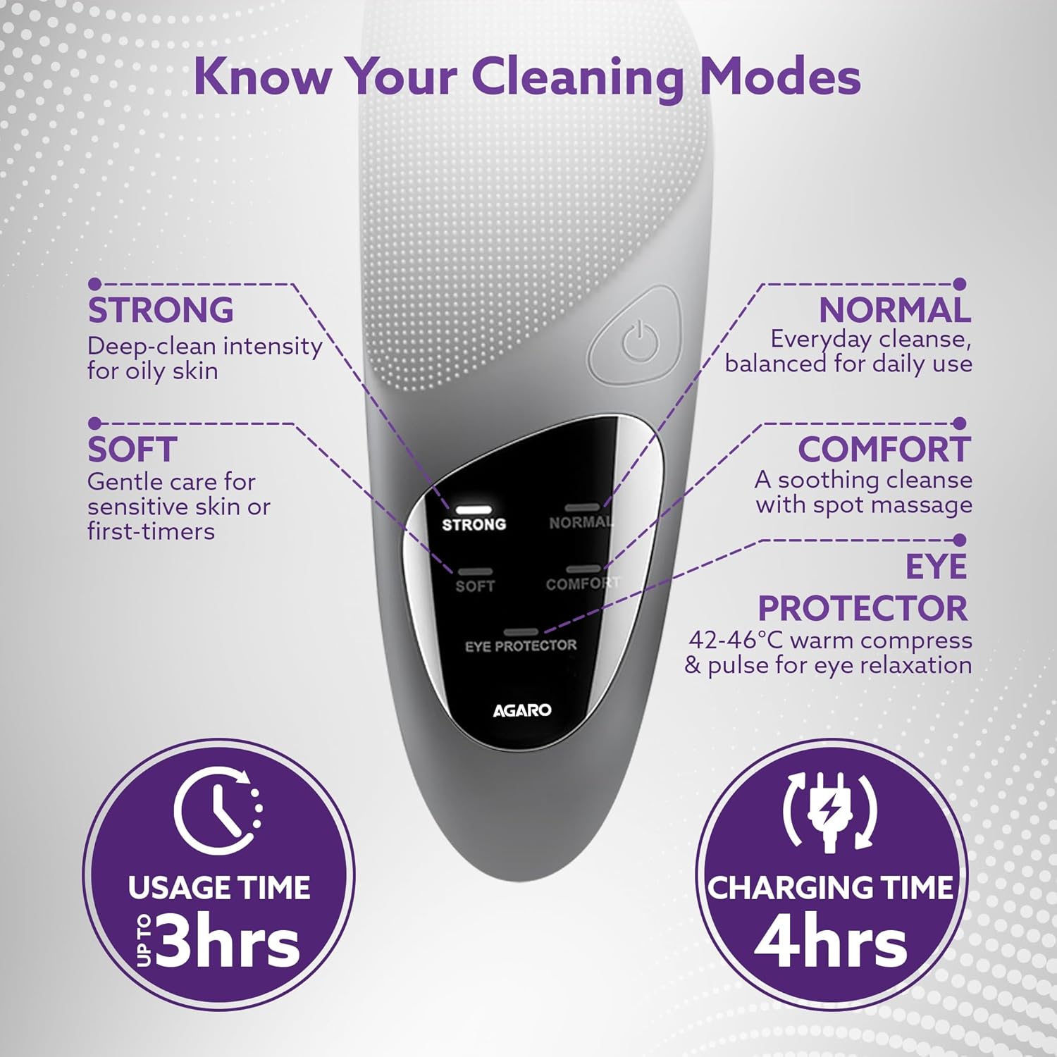 AGARO CM2407 Facial Cleansing Massager with Sonic Vibration Technique comes with 5 Cleaning Modes. It is Waterproof and has Soft Silicone Bristles