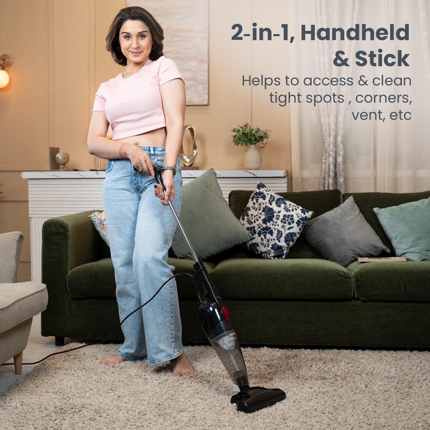 Powerful 2 in 1 vacuum cleaner with stick which allows you to customize vacuuming as per your needs.;Effective for floor, upholstery, sofas, carpet & hardwood floors. Picks up all kinds of crumbs, pet hair, dust etc.