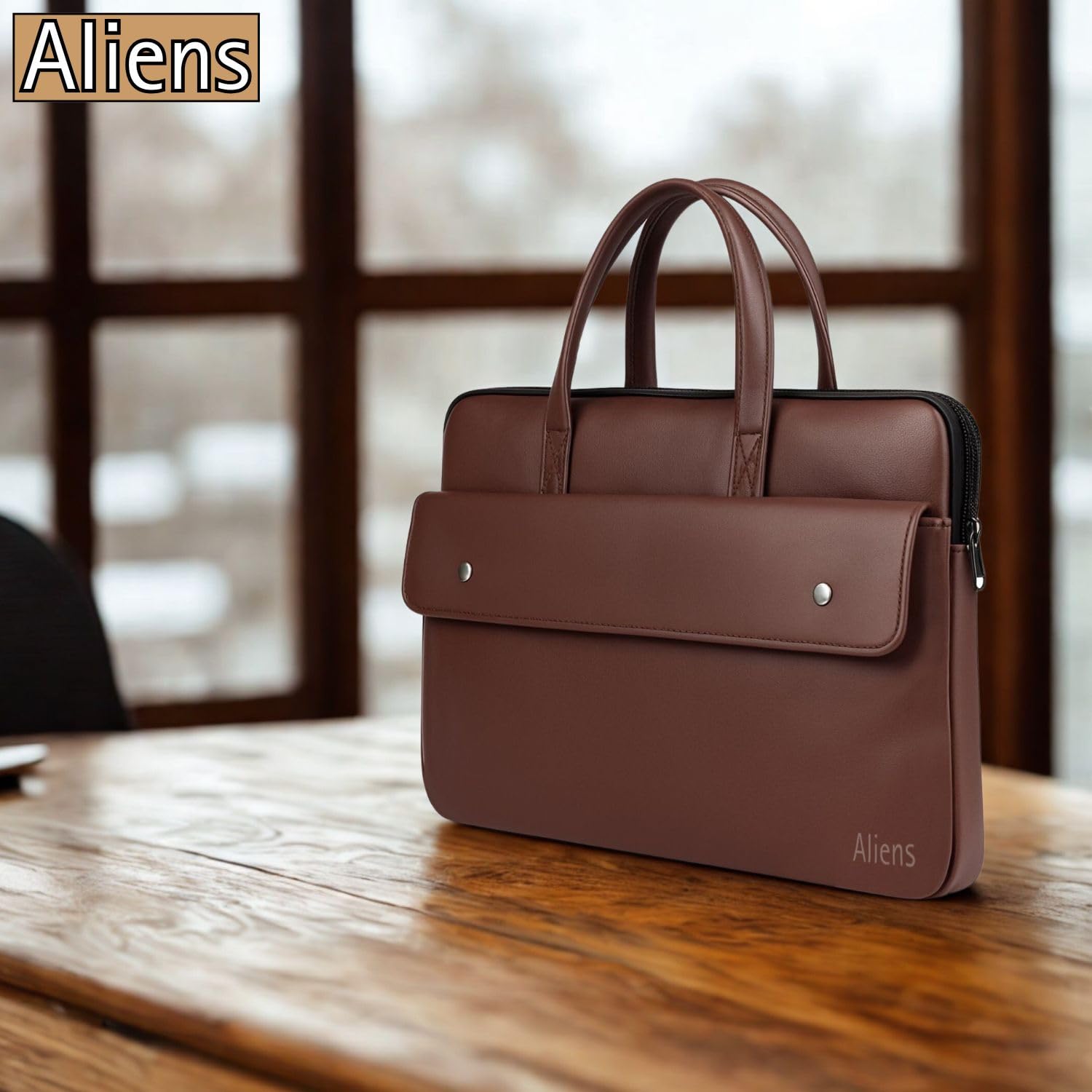 The Aliens 14.1″ Premium Vegan Leather Laptop Sleeve/Case Cover Bag in Grey is designed to deliver both luxury and functionality for everyday professionals. Crafted from high-quality vegan leather, it offers a sleek, sophisticated look that’s both eco-friendly and water-resistant—ideal for safeguarding your laptop in any setting. The padded main compartment features a smooth dual zipper to securely hold your 14.1-inch device, such as MacBook Air/Pro, Dell, Lenovo, Acer, or Asus. A separate front compartment with metal button closures provides additional space to store tablets, chargers, cables, or other essential accessories. Whether you’re headed to the office, a meeting, or traveling, this laptop sleeve combines elegance with practicality. The reinforced leather handle ensures a firm and comfortable grip, while its lightweight and slim profile makes it easy to carry on its own or tuck into another bag. The minimalist design adds a touch of class, making it a perfect fit for modern professionals, students, and digital nomads who value style, protection, and convenience in one refined package.