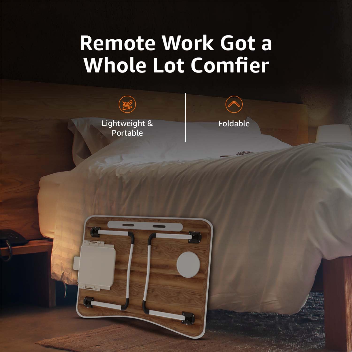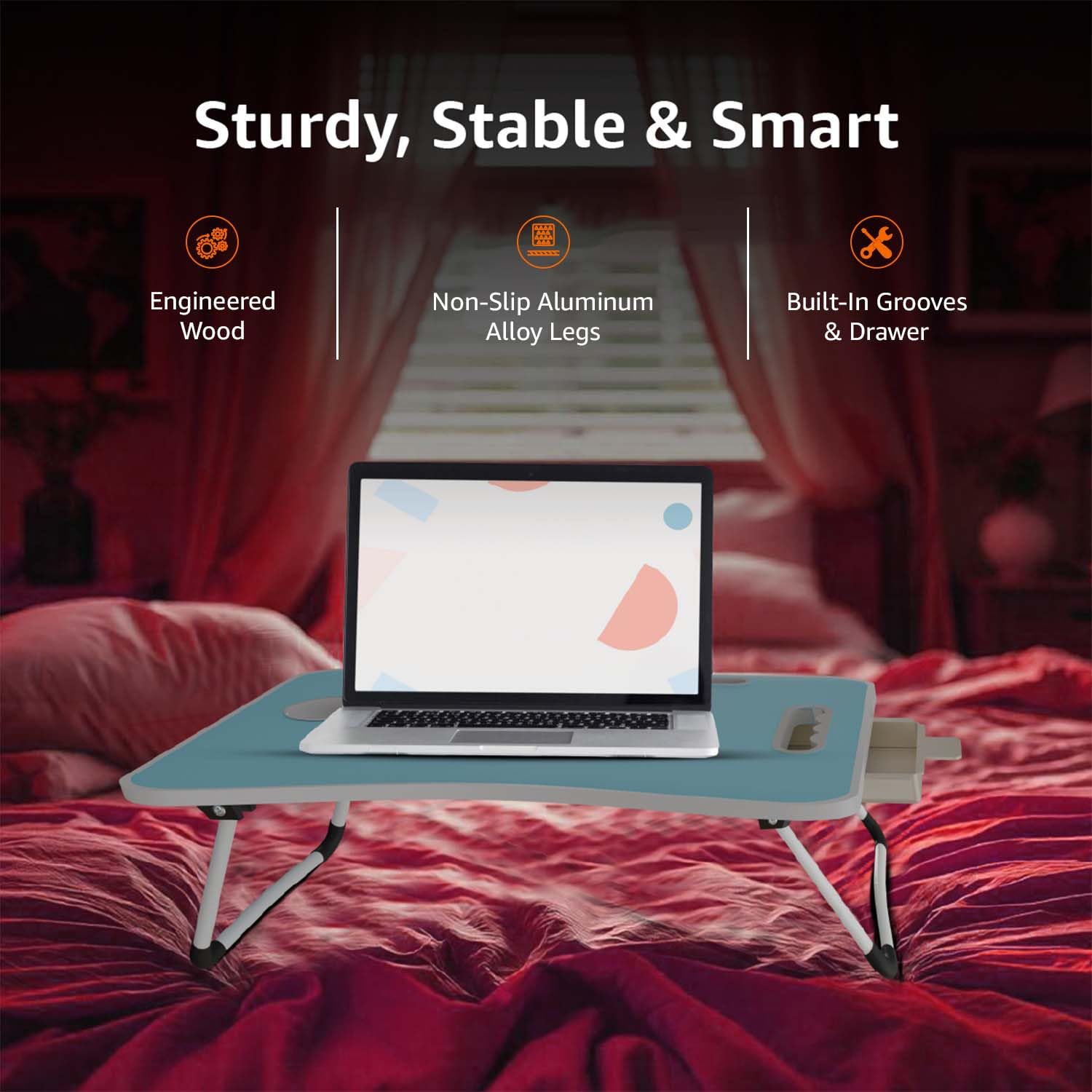 It fits nearly any laptop and has space for a mouse or book, a built-in groove for a tablet or smartphone, a cup holder and a mini-drawer for small accessories.
