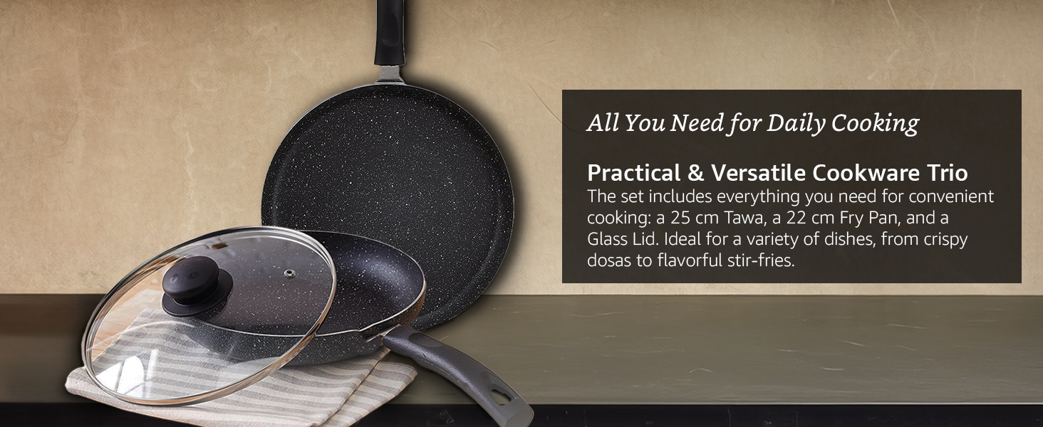 PACKAGE CONTENTS: 25 cm Tawa, 22 cm Fry Pan, 1 Glass Lid