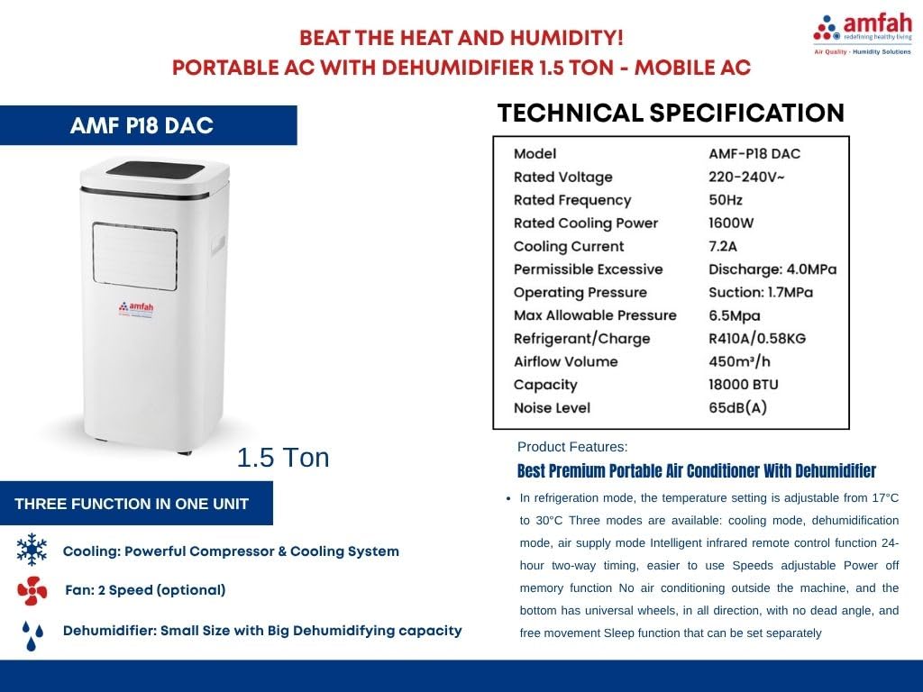 AMFAH AMF-P18 DAC 1.5 Ton Portable AC with Dehumidifier & Air Filter ❄️🌬️ Stay cool and comfortable with the AMFAH 1.5 Ton Portable Air Conditioner, designed to provide powerful cooling and dehumidification. Perfect for any room, it offers a versatile 3-in-1 solution: Cooling Mode, Dehumidification Mode, and Air Supply Mode 🌡️💧. Key Features: Powerful Cooling: Adjustable temperature from 17°C to 30°C to suit your needs 🔥❄️ Dehumidifier: Keeps your room fresh and dry by reducing excess moisture 💧 Air Filter: Ensures clean, breathable air 🌿 Remote Control: Convenient control from anywhere in the room 🖥️ Sleep Mode: Set it for a peaceful night’s rest 💤 24-Hour Timer: Automatically adjusts cooling with a 2-way timer ⏰ Adjustable Fan Speeds: Choose the airflow that suits you 🌬️ No Manual Drainage Needed: Hassle-free operation 🚫💦 Movable Design: With castor wheels for easy movement around your space 🏡 Get the AMFAH Portable AC for efficient and effective cooling—whether you’re in the living room, bedroom, or office! AMFAH AMF-P18 DAC | 1.5 Ton Portable AC with Dehumidifier | Air Filter | Remote Control | Timer | Sleep Mode | 3 Modes | No Manual Drainage | Movable Design | 1-Year Product & 4-Year Compressor Warranty