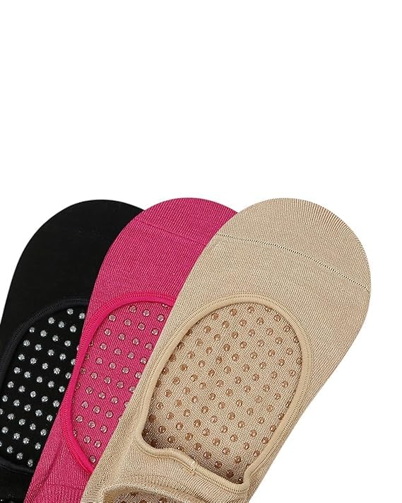 Step into comfort with these versatile non-slip ballet flat socks, perfect for everyday wear. This pack of three pairs comes in classic beige, vibrant pink, and sleek black colours to complement any outfit. The specially designed grip dots on the sole provide excellent traction, helping prevent slips on smooth surfaces. These low-cut socks feature an elastic band that keeps them securely in place while remaining invisible when worn with flats or casual shoes. The lightweight, breathable fabric ensures your feet stay comfortable throughout the day. Ideal for yoga, pilates, dance, or simply lounging at home, these socks combine style with functionality. The no-show design makes them a perfect choice for wearing with ballet flats, loafers, or any casual footwear. The stretchy material provides a snug fit while the reinforced toe area adds durability. These versatile socks are a practical addition to any wardrobe, offering both style and safety in one package.