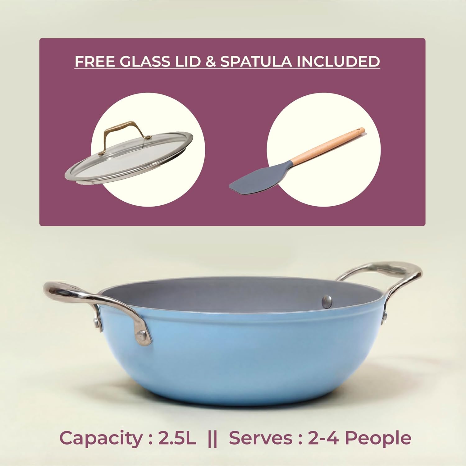 FEATHER LIGHT: At 1.3 kg (including glass lid), it is much lighter than steel kadais. Built for multi-tasking in Indian kitchen.