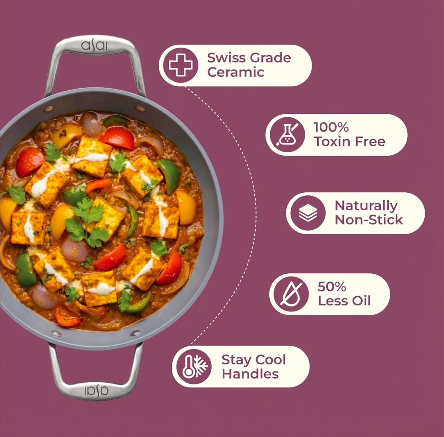 NATURALLY NON-STICK: 50% Less Oil and effortless food release. From quick tadkas and crisp bhindi to paneer butter masala, it makes everyday cooking smooth.