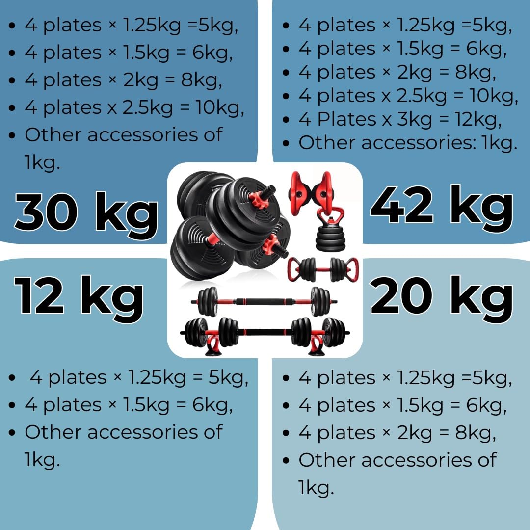 20kgs dumbbell set contains: 4 plates × 1.25kg =5kg, 4 plates × 1.5kg = 6kg, 4 plates × 2kg = 8kg & other accessories of 1kg.