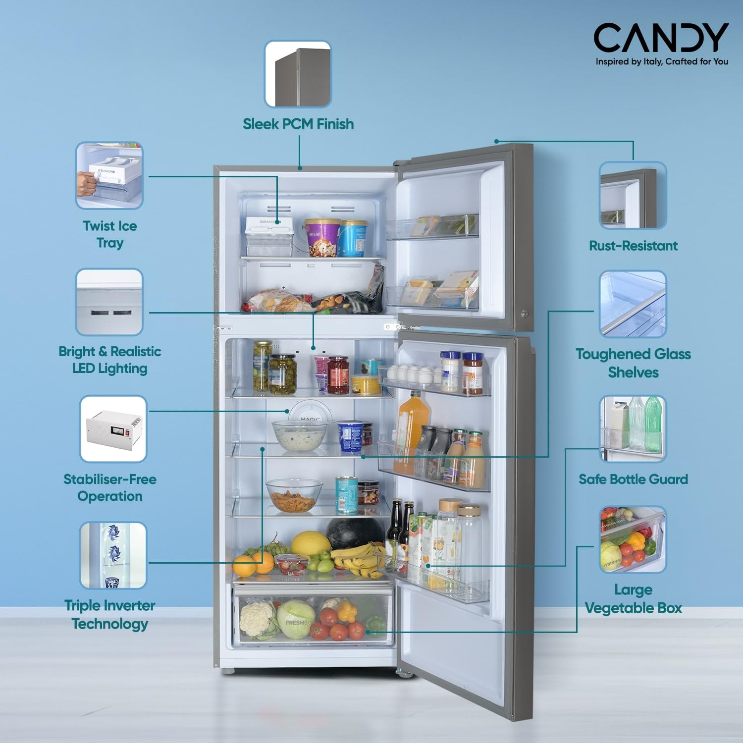 Experience ultimate flexibility with this innovative Candy 328L double door refrigerator featuring groundbreaking 10-in-1 convertible technology. Transform your freezer compartment to additional fridge space and back in just 50 minutes, adapting to your changing storage needs. The triple inverter technology ensures efficient cooling while the frost-free design eliminates tedious manual defrosting. A convenient twist ice maker lets you prepare ice quickly, while the dual fan motor technology maintains consistent temperature throughout. The sleek Moon Silver finish adds sophistication to any kitchen. Multiple modes including Normal, Veg, Cold Drink, Fast Freezer and Power Saving cater to diverse storage requirements. The spacious vegetable box keeps produce fresh longer. Featuring toughened glass shelves and precise thermostat control, this refrigerator combines functionality with durability. Backed by a comprehensive warranty of 1 year on product and 10 years on compressor, this refrigerator brings Italian engineering excellence to your home.