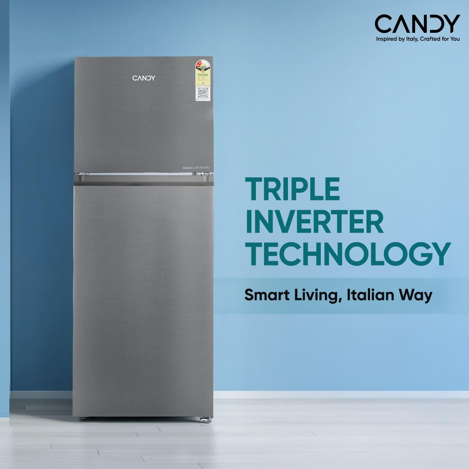 Experience ultimate flexibility with this innovative Candy 328L double door refrigerator featuring groundbreaking 10-in-1 convertible technology. Transform your freezer compartment to additional fridge space and back in just 50 minutes, adapting to your changing storage needs. The triple inverter technology ensures efficient cooling while the frost-free design eliminates tedious manual defrosting. A convenient twist ice maker lets you prepare ice quickly, while the dual fan motor technology maintains consistent temperature throughout. The sleek Moon Silver finish adds sophistication to any kitchen. Multiple modes including Normal, Veg, Cold Drink, Fast Freezer and Power Saving cater to diverse storage requirements. The spacious vegetable box keeps produce fresh longer. Featuring toughened glass shelves and precise thermostat control, this refrigerator combines functionality with durability. Backed by a comprehensive warranty of 1 year on product and 10 years on compressor, this refrigerator brings Italian engineering excellence to your home.