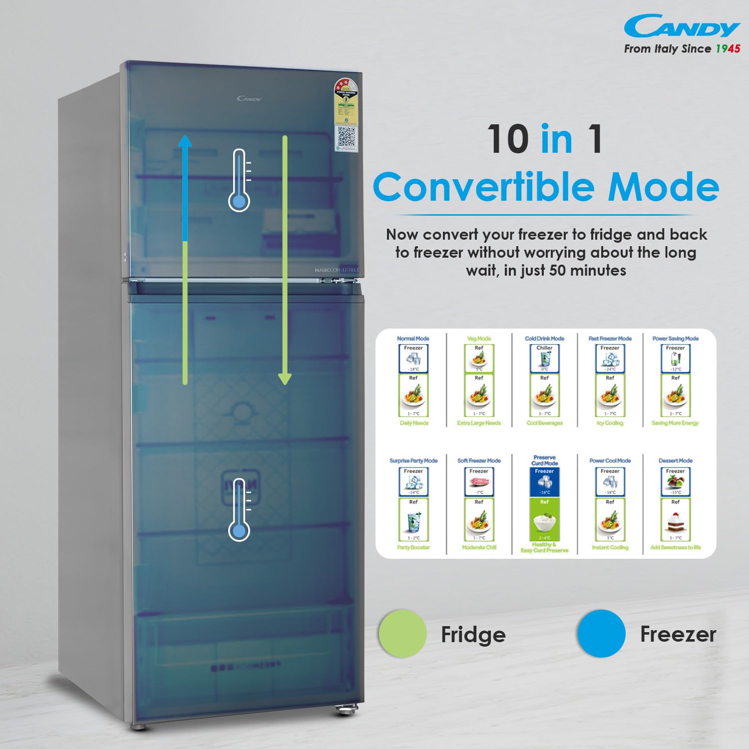 CONVERTIBLE MODES: Features 10-in-1 convertible technology allowing quick transformation between fridge and freezer in just 50 minutes, offering versatile storage options