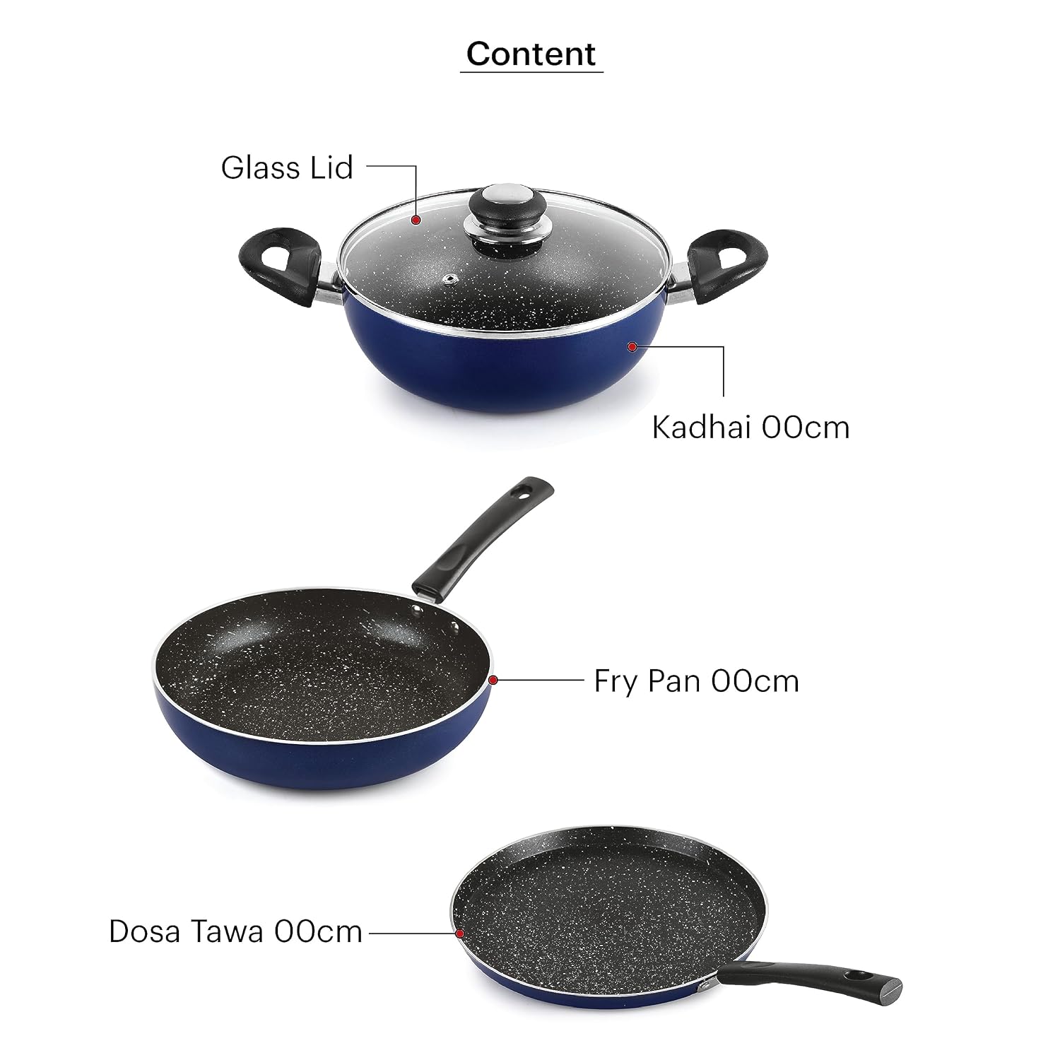 Cello Regal Set of 5 Pieces Kitchen Cookware Set, Blue | 1 Pc Dosa Tawa, 1 Pc Fry Pan, 1 Pc Kadhai with Glass Lid & 2 Nylon Spatula | Gas Stove & Induction Friendly Aluminium Non Stick Cookware Set