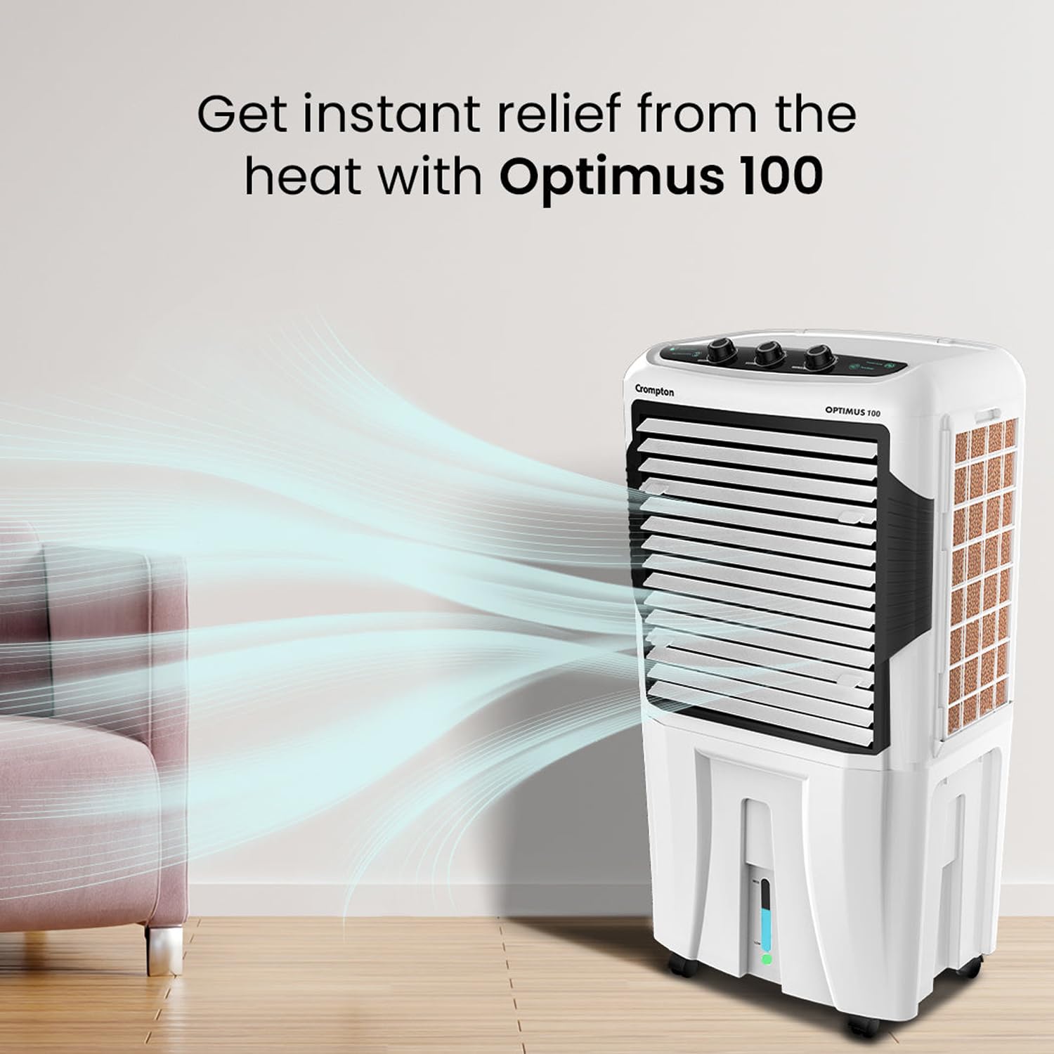 Product Details: Crompton’s high performance portable Desert air cooler with high density honey comb cooling pads and 3-way speed settings for air speed control