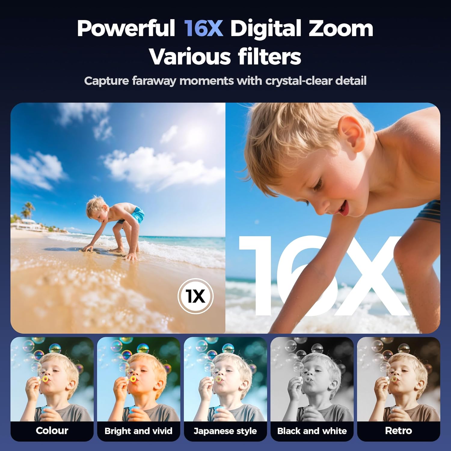 16X Digital Zoom & Compact Size:Get closer to the action with 16x digital zoom. Its lightweight, portable build fits easily into a pocket, making it ideal for everyday snapshots, travel, and casual filming. The sleek black finish adds a modern touch, suitable for both kids and adults.