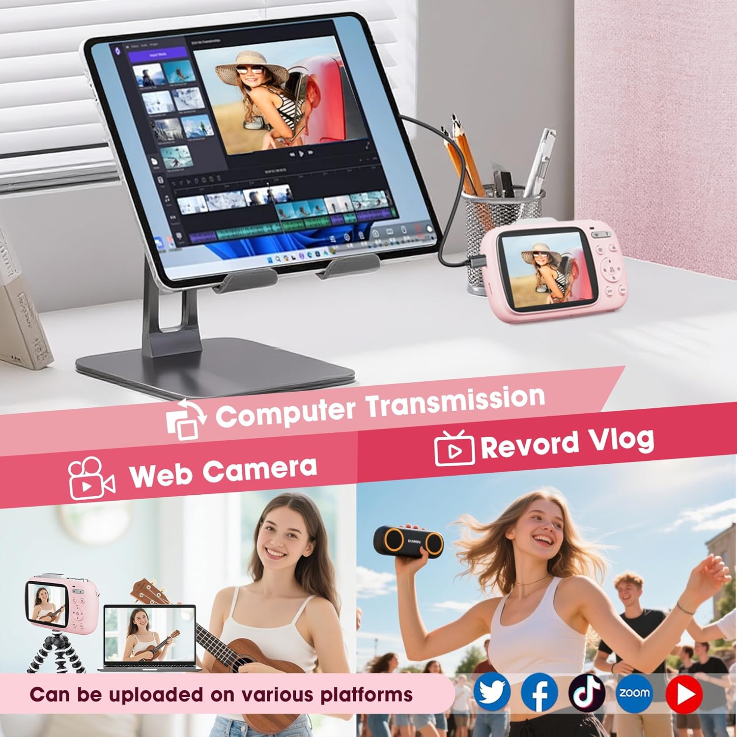 【Stylish Pink Digital Camera】This fashionable pink camera features a scratch-resistant 2.8″ tempered screen and 2.5D curved edges. Compact size (4.33×0.96×2.66 inch, 0.7lbs) fits in pockets. Perfect compact camera for travel, hiking, and daily snaps.