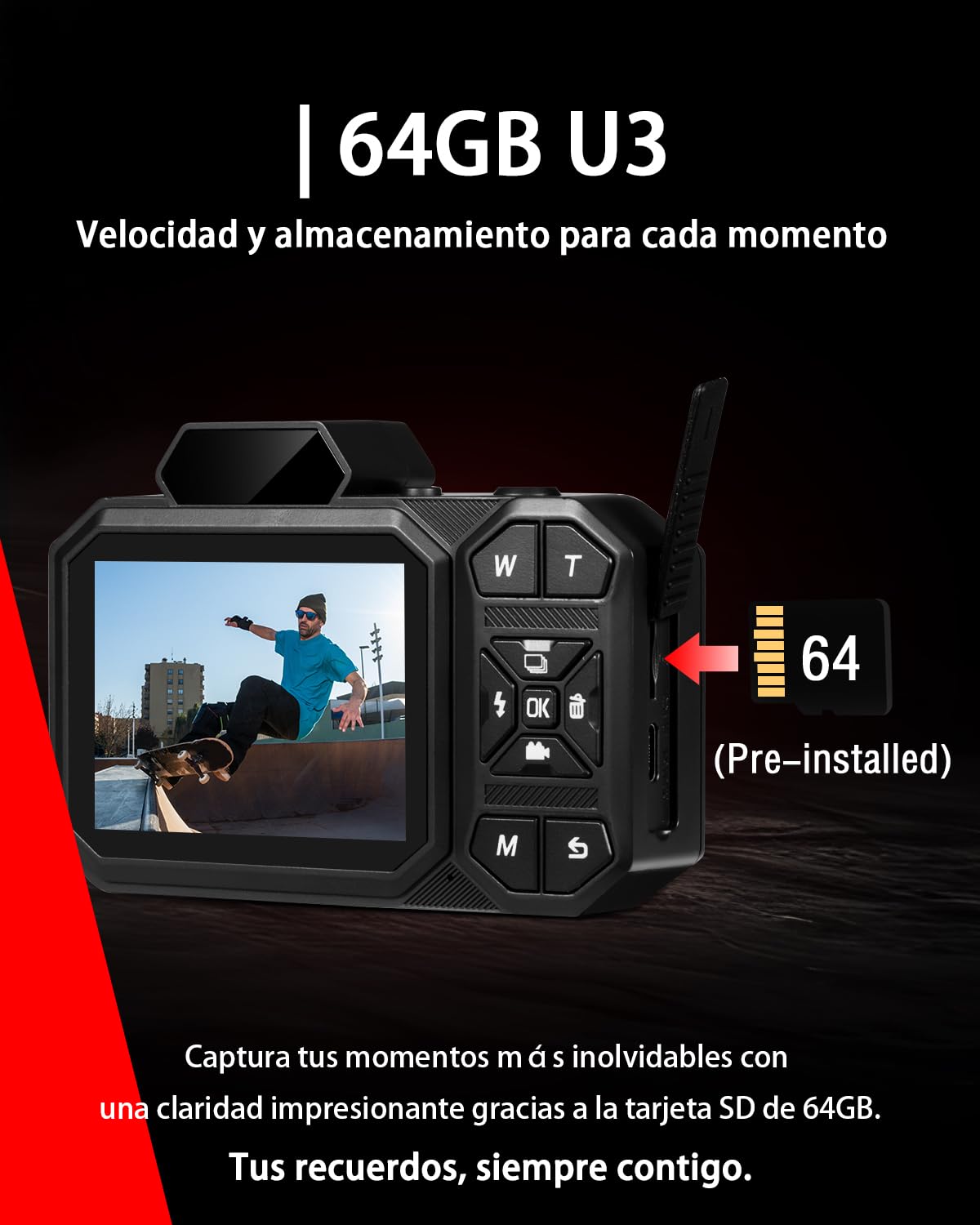 【Larger 2000mAh Battery & Free 64GB Card】 Benefit from a powerful 2000mAh battery and advanced energy-saving technology, ensuring longer usage time and fewer charges, perfect for vacations, events, and family moments. This camera for photography included 64GB memory card, offers plenty of storage for HD videos and travel photos, so you can shoot more and swap less.