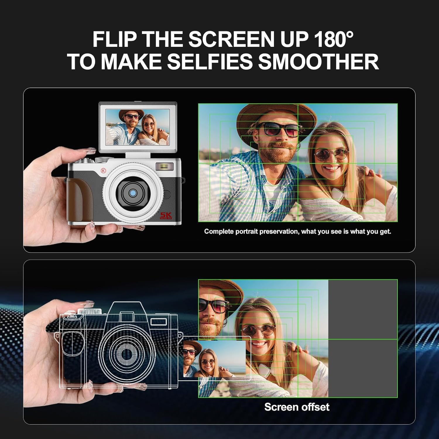 【64MP Digital Camera with Flip Screen】The digital camera with 5K video and 64MP photo resolution for photography and video. Cameras for photography has a 3-inch screen and can rotate 180 degrees, allowing you to see what’s being recorded or view it while taking a vlog from any angle.