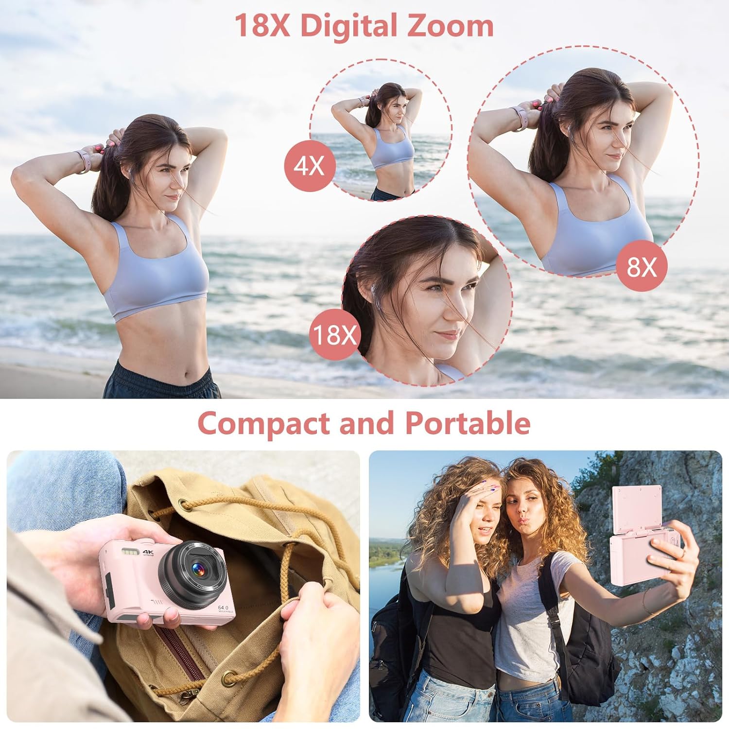 Digital Camera for Photography, 4K Vlogging Camera for YouTube 3″ 180° Flip Screen 18X Digital Zoom Compact Cameras with 32GB TF Card & 2 Batteries, Pink