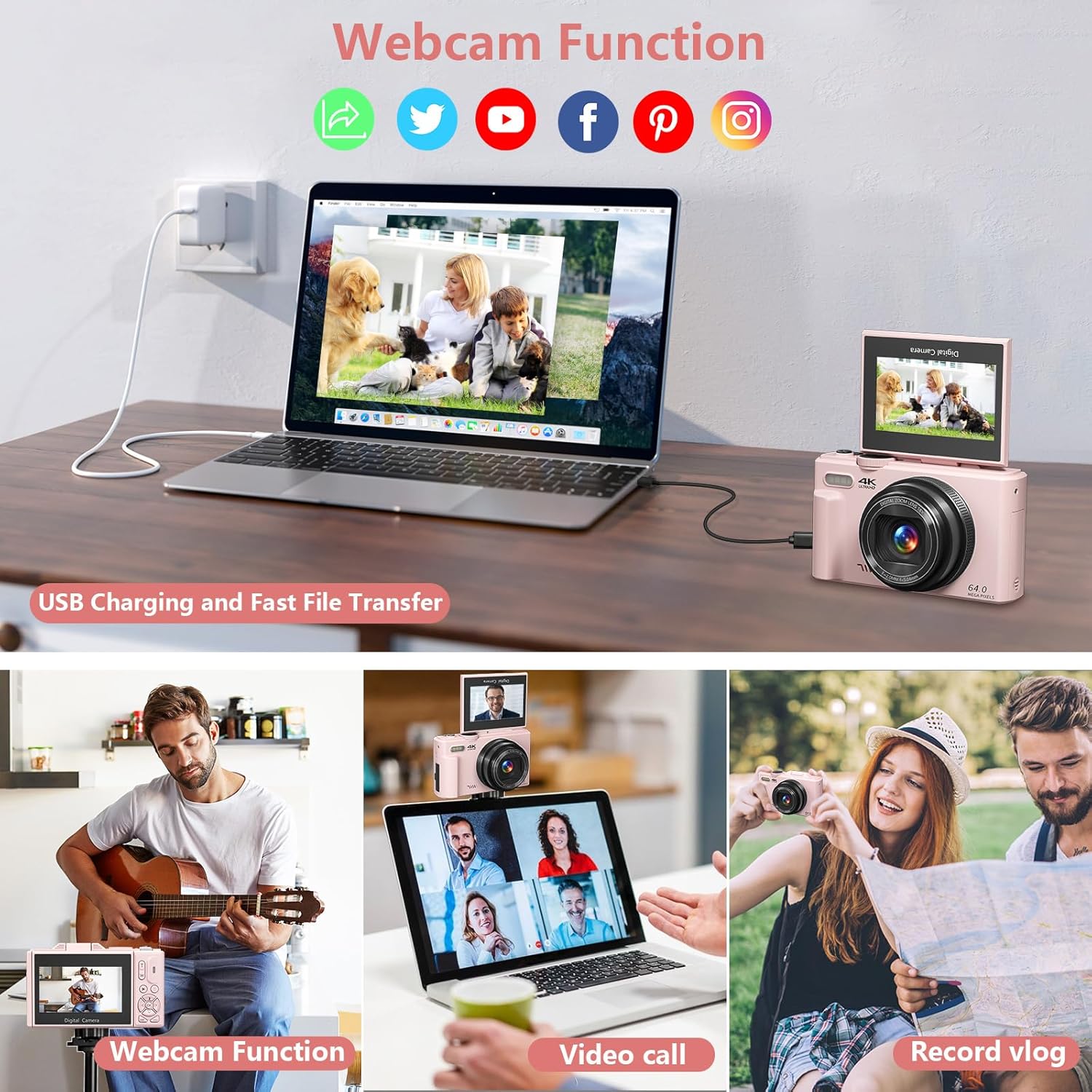【Wireless WIFI & Webcam/Vlogging Function】The upgraded digital camera for youtube has built-in wireless WIFI function, allowing you to share videos and photos online instantly using your cell phone. The vlog camera can be used as a webcam, making it easy for you to make live streams or video calls on YouTube, Facebook, Twitter or other social media. The USB cable that comes with the package can be used not only for charging but also for transferring