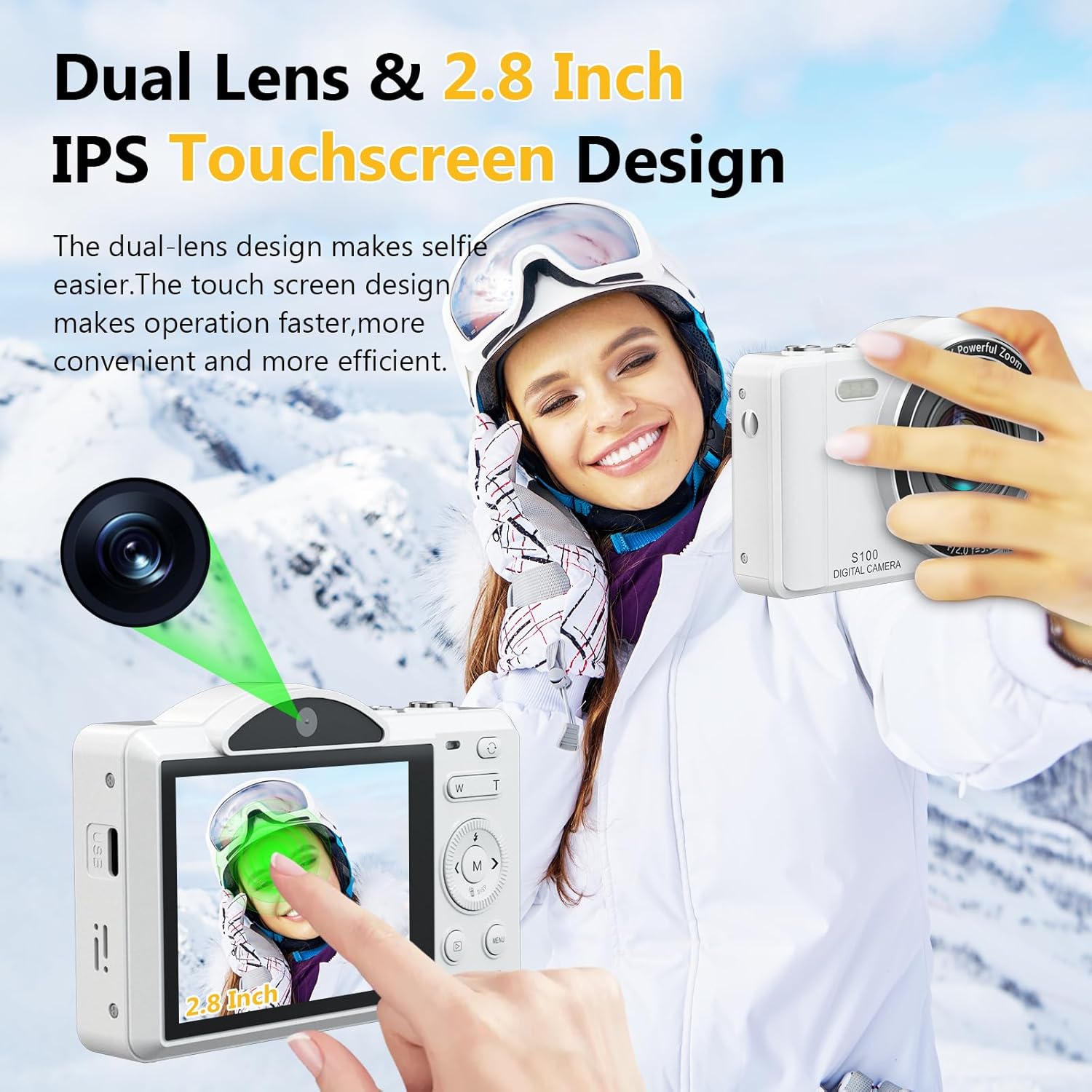 【Upgraded Dual Cameras with 2.8″ IPS Touch Screen】 Innovative dual-cameras( front & rear) design! With just one click, switch to the front camera for effortless selfies, while the rear camera lets you explore a variety of creative shooting techniques. The newly upgraded touchscreen makes operation smoother and more efficient than ever