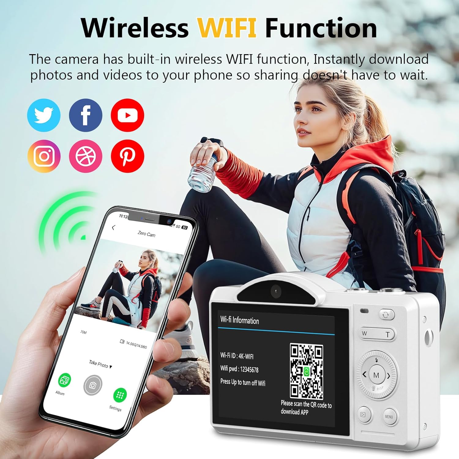 【Webcam & WiFi Function】 This Point and Shoot Digital Camera supports video mode and comes with a built-in microphone. Connect it to your computer via a USB cable to use it as a webcam for video calls and live streaming. You can also connect your phone to the camera’s WiFi to transfer photos instantly, making it easy to share your best moments on social media in real time