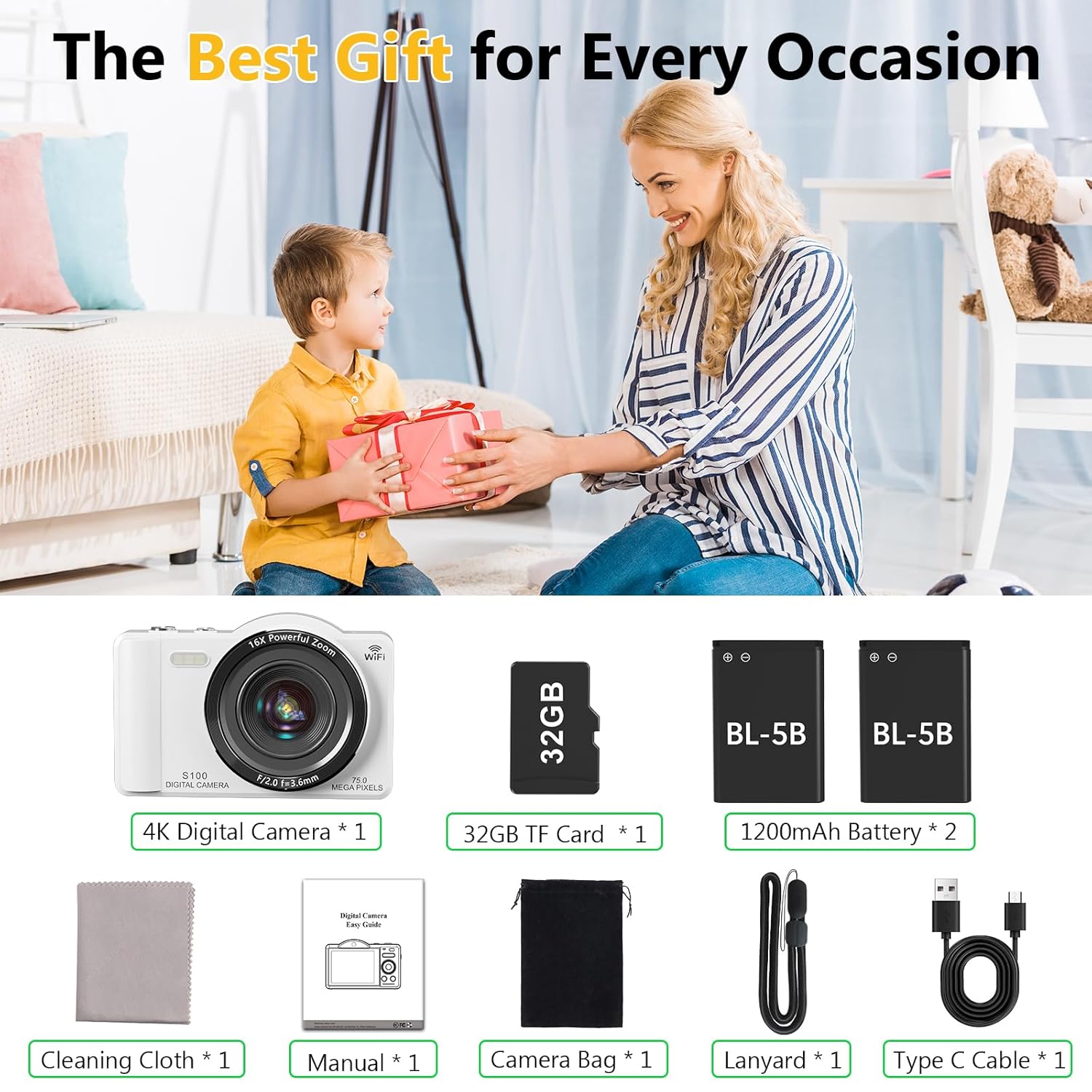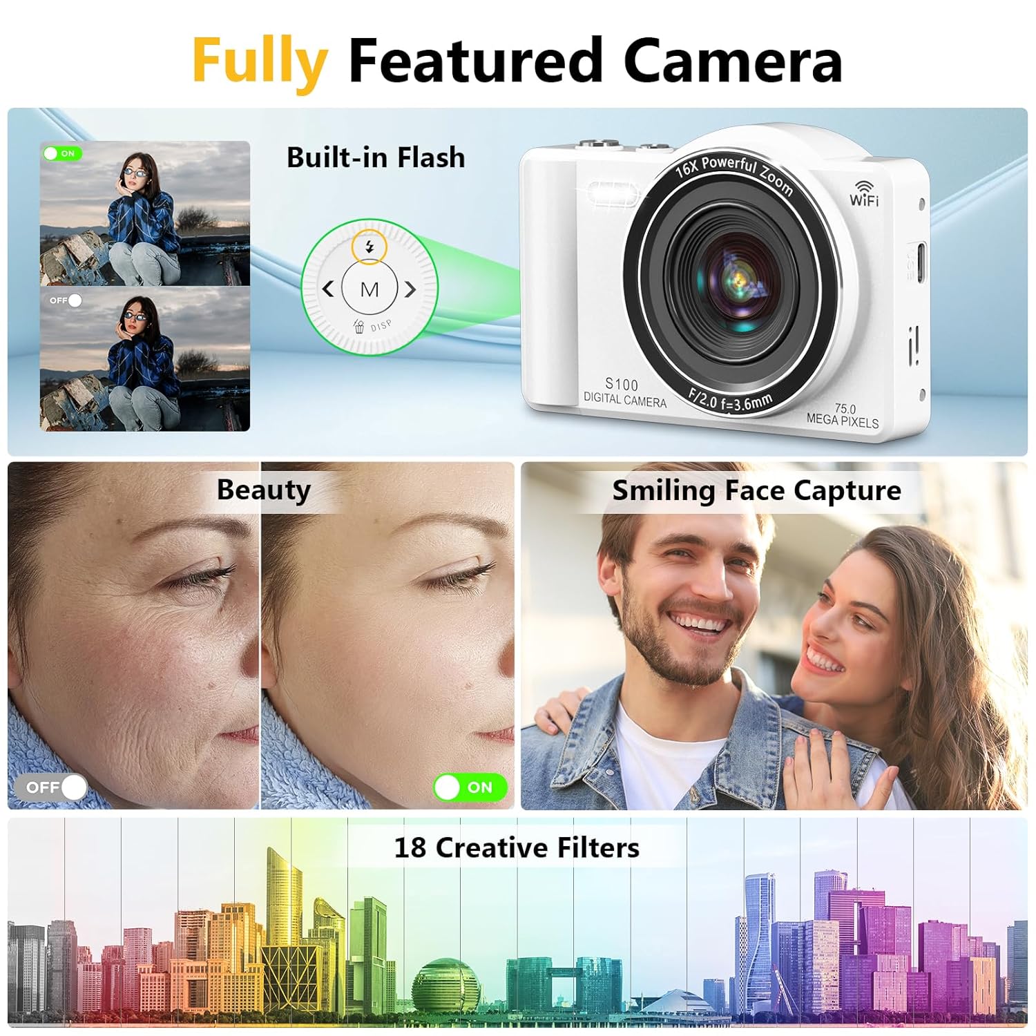 Digital Camera for Photography – WiFi 4K 75MP Vlogging Cameras for YouTube, Touchscreen Autofocus Point and Shoot Digital Camera for Teens Adult Beginner with 16X Zoom, 32GB Card, 2 Batteries(White)