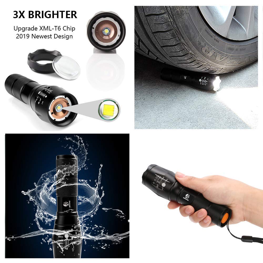 ADJUSTABLE FOCUS: Intense Spotlight for long range observation can up to 600 feet, Circle Floodlight for large area illumination.Five Light Modes: Half press tail button to switch the High / Middle / Low / Strobe / SOS light mode, and fully press it to operate ON/OFF switch, easy to use.ADVANCED DESIGN: Aircraft grade alloy, premium type 3 hard-anodized. Skid-Proof design & Water Resistant design (Highest water-resistant level of IPX-6).SPECIAL POWER: The Super Bright Flashlight is powerful enough to light up an entire room or zoom in on distant objects.POWER SOURCE: 1×18650 Li-on Rechargeable Battery (Not Included) or 3× AAA Battery (Not Included).