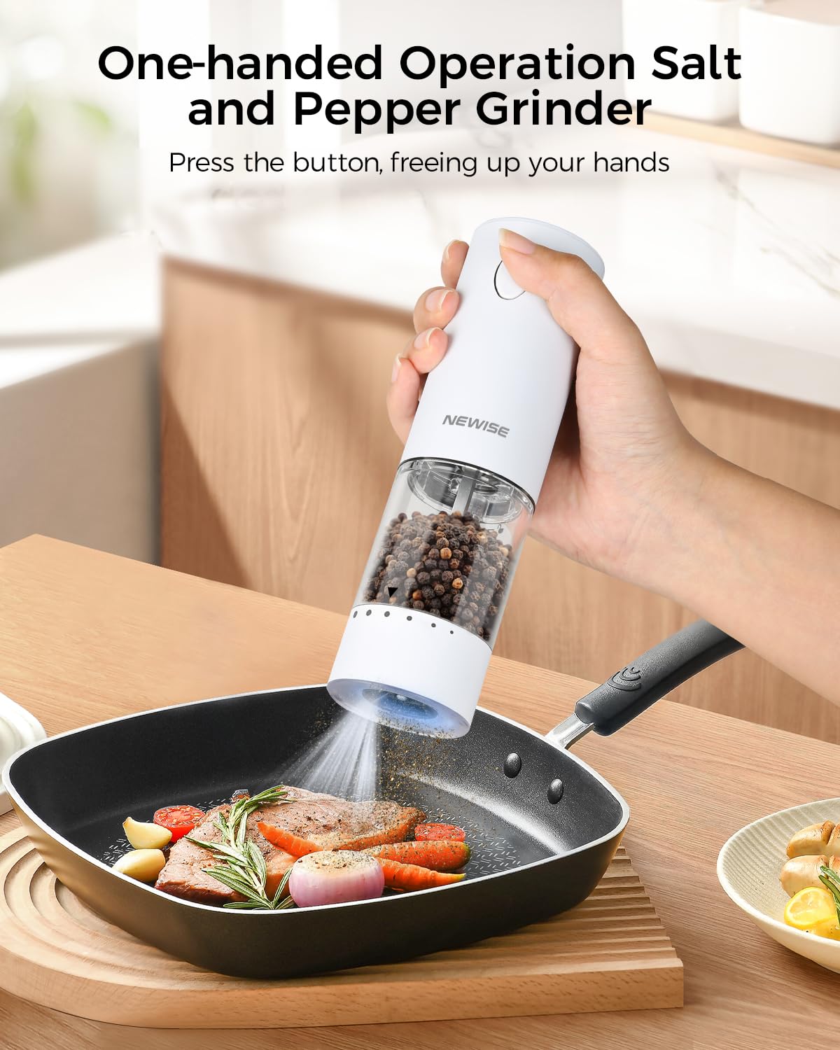 【Easy to Use】Elevate your cooking experience with the touch of a button using the automatic pepper and salt grinder. Simply press and hold with one hand for a smooth and effortless grind. The LED light illuminates your culinary creations, allowing you to easily see and control the amount of spice you desire