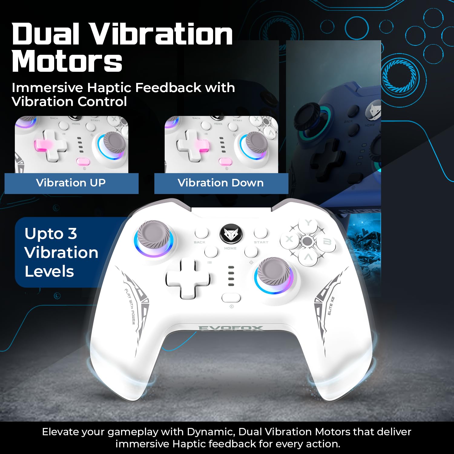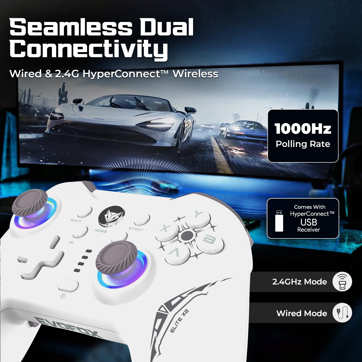 Unleash your gaming edge with the EvoFox Elite X2—built for precision, comfort, and domination. Featuring drift-free Hall Effect Joysticks, dual wireless + wired modes, Turbo Mode, EZ Macros, and immersive feedback, it’s the ultimate weapon for every serious PC gamer.