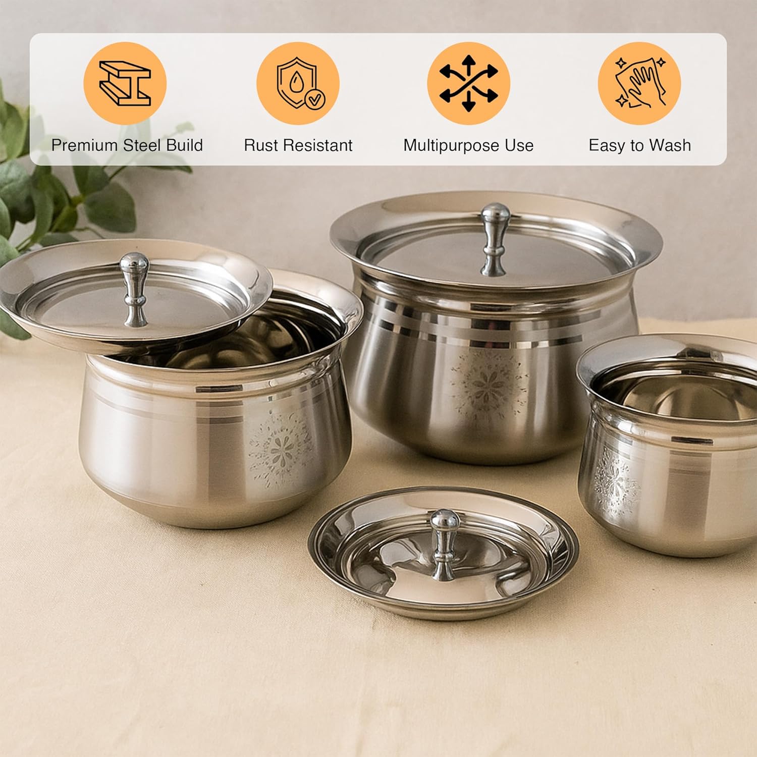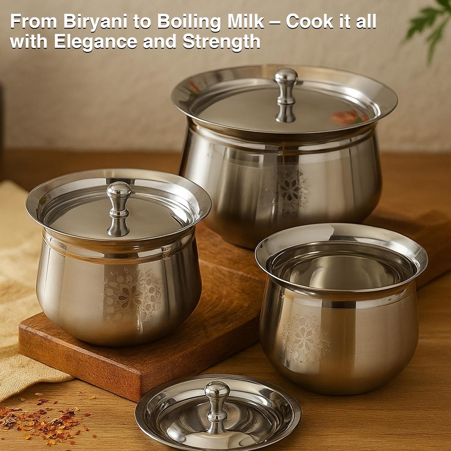 Expresso Stainless Steel Handi with Lid Set of 3 for Cooking Serving Bowl biryani Milk Pot Pan Finish Degchi Tope/Tapeli/Bhaguna Handis Pots 650/1000/1400ml (Silver)