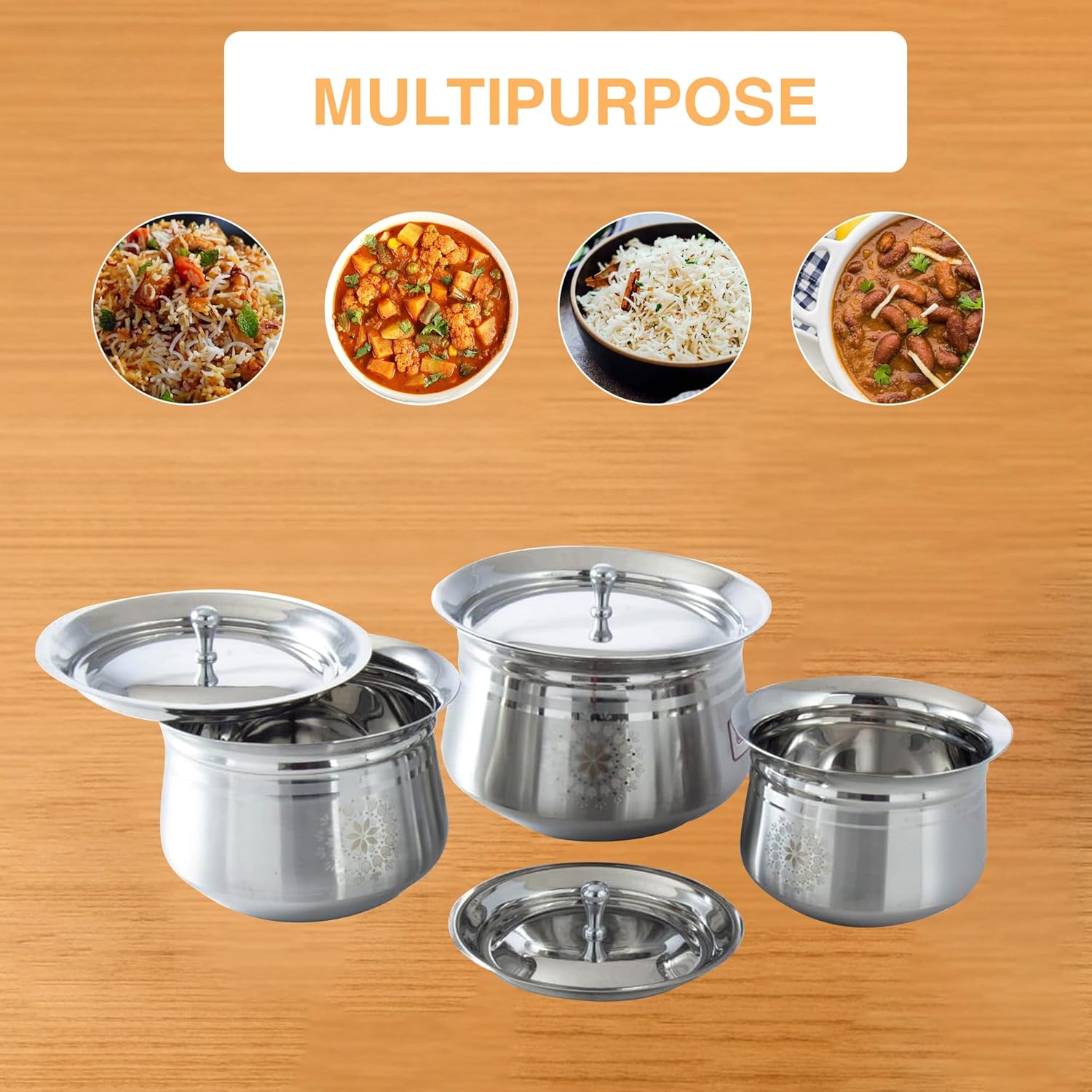 EXPRESSO Stainless Steel Handi with Lid Set of 3 for Cooking Serving Bowl biryani Milk Pot Pan Finish Degchi Tope/Tapeli/Bhaguna Handis Pots 650/1000/1400ml (Silver)