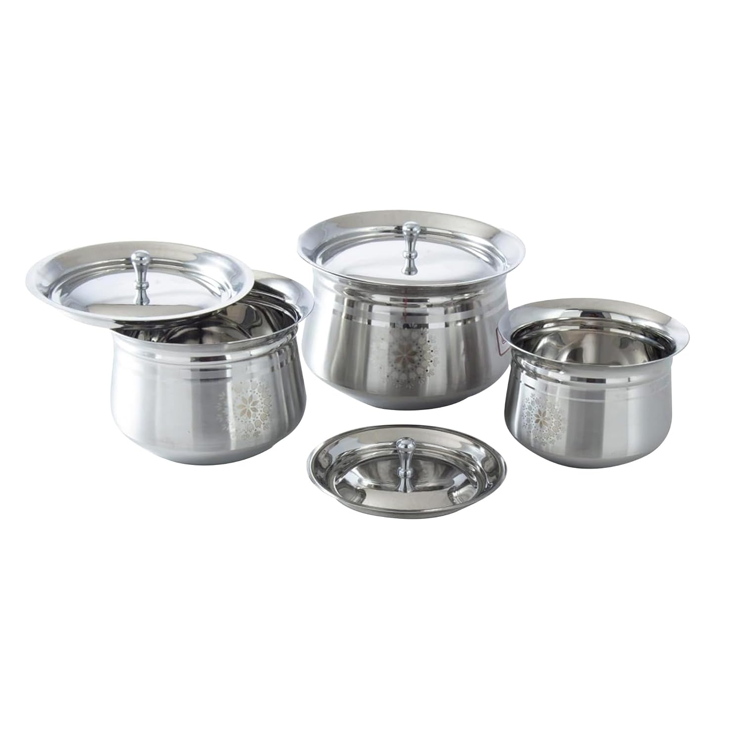 This set of three brilliant Stainless steel rice biryani serving dishes is a must carry for every dining table. This Degchi set is perfect for serving vegetables, rice, biryani and dal without spillage. Our Stainless steel biryani handis have a smooth surface that makes them wash up well in the sink or dishwasher. It can stack evenly, which could save a lot of space in your kitchen.