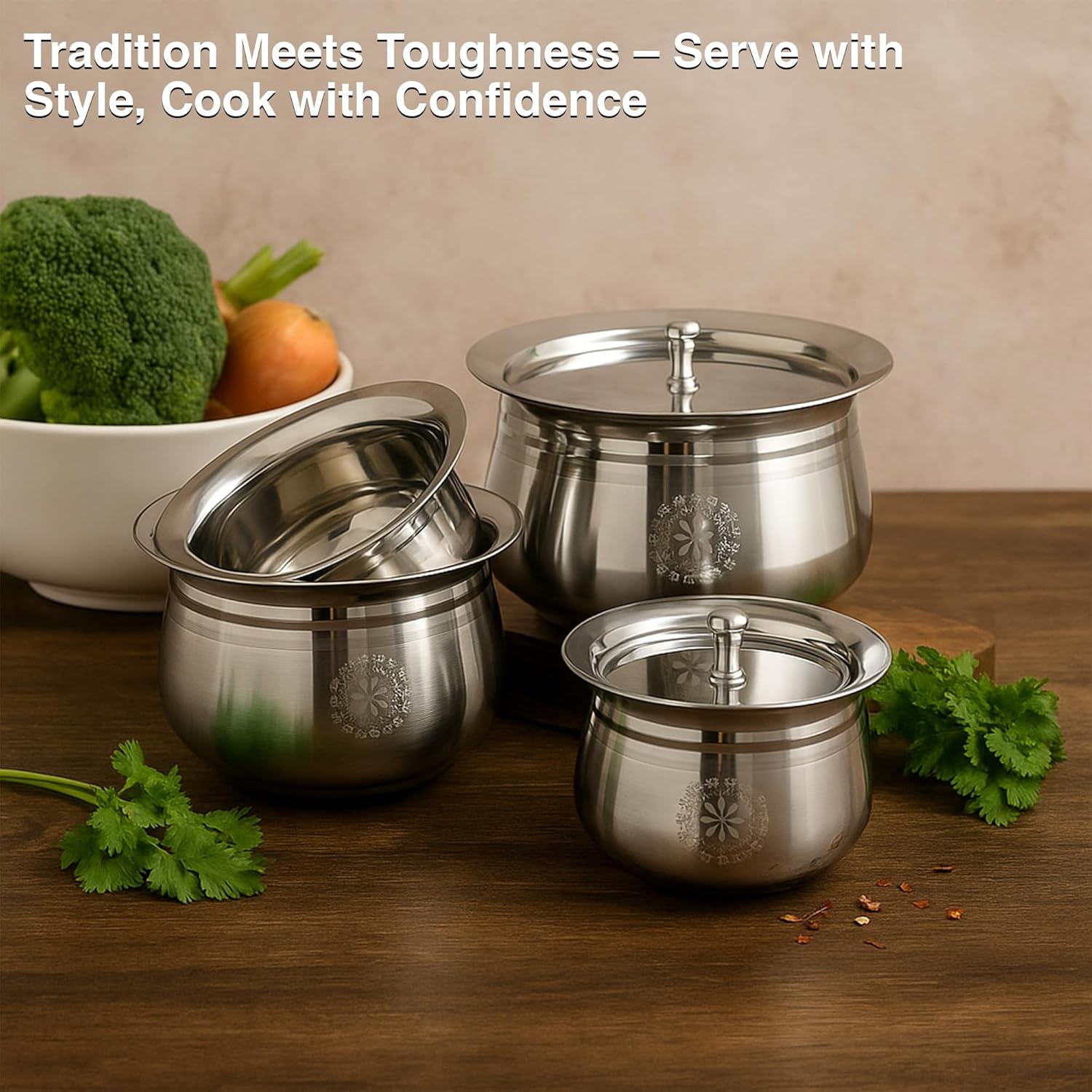 Expresso Stainless Steel Handi with Lid Set of 3 for Cooking Serving Bowl biryani Milk Pot Pan Finish Degchi Tope/Tapeli/Bhaguna Handis Pots 650/1000/1400ml (Silver)