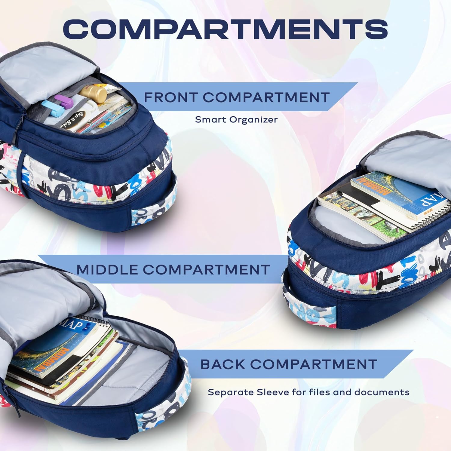 This school backpack is designed to balance organization and comfort for active students. Featuring three spacious compartments, it includes a front compartment with an organizer for quick access to essentials and a last compartment with a sleeve for secure storage of books or devices. A side bottle holder ensures hydration on the go. The breathable mesh back panel, padded shoulder straps, and sturdy padded handle provide superior comfort and support, making it an ideal choice for daily use. Stylish, durable, and functional—this backpack is ready for every school day adventure.