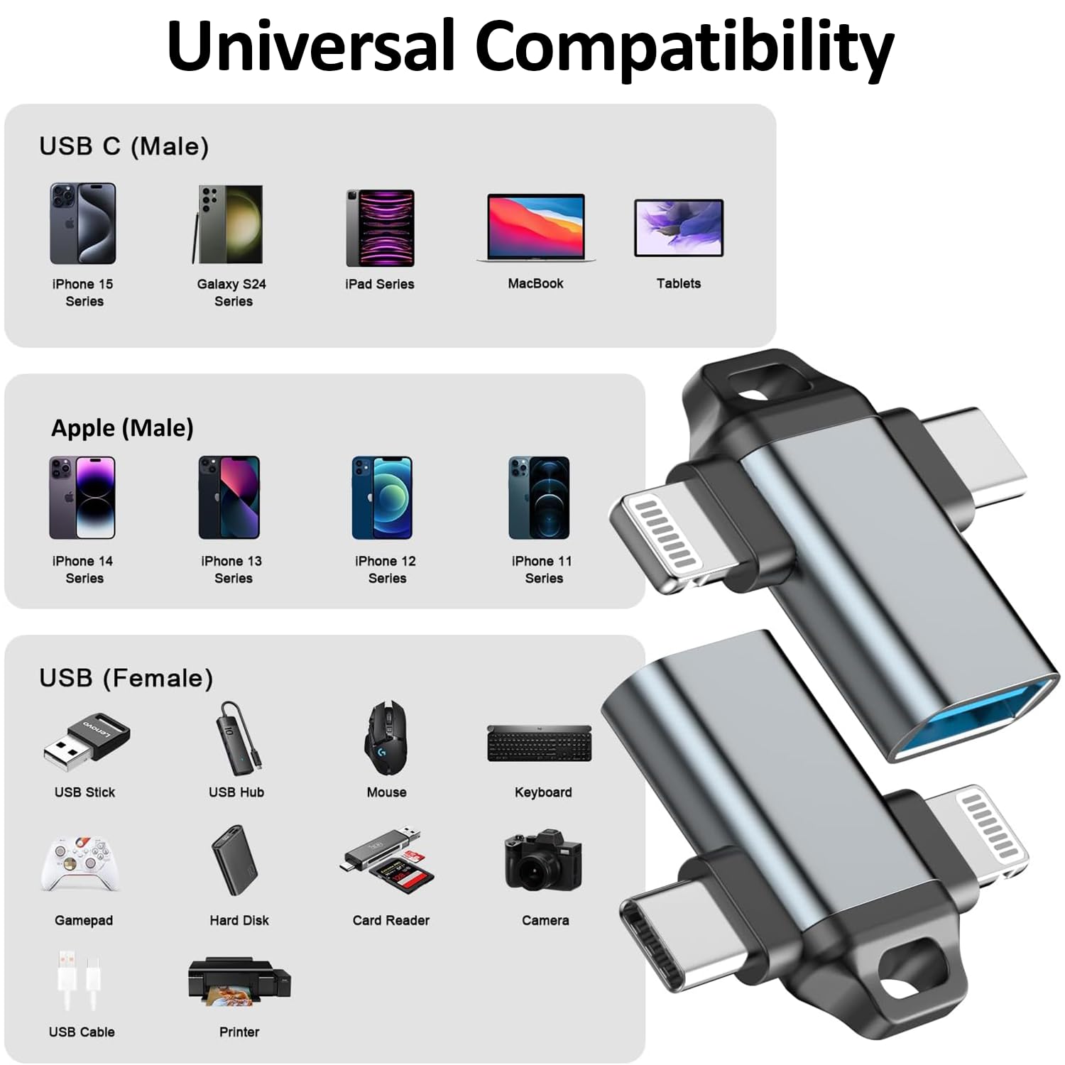 ►UNIVERSAL COMPATIBILITY: Compatible with iPhone 17/17 Plus/17 Pro/17 Pro Max, 16/16 Plus/16 Pro/16 Pro Max,15/15 Plus/15 Pro/15 Pro Max, iPhone 14/14 Plus/14 Pro/14 Pro Max/13/13 Mini/13 Pro/13 Pro Max/12/12 Mini/12 Pro/12 Pro Max/11/11 Pro/11Pro Max/XS, iPad Pro/Mini/Air, MacBook Air/Pro, Galaxy S25/S25+/S25 Ultra, Galaxy S24/S24+/S24 Ultra/S23/S23+/S23 Ultra/S22/S22+/S22 Ultra/S21/S20/S10, Pixel 8/7/6/5/4/3/2 XL and more. Please note that this OTG Adapter supports only iOS 13 or later systems