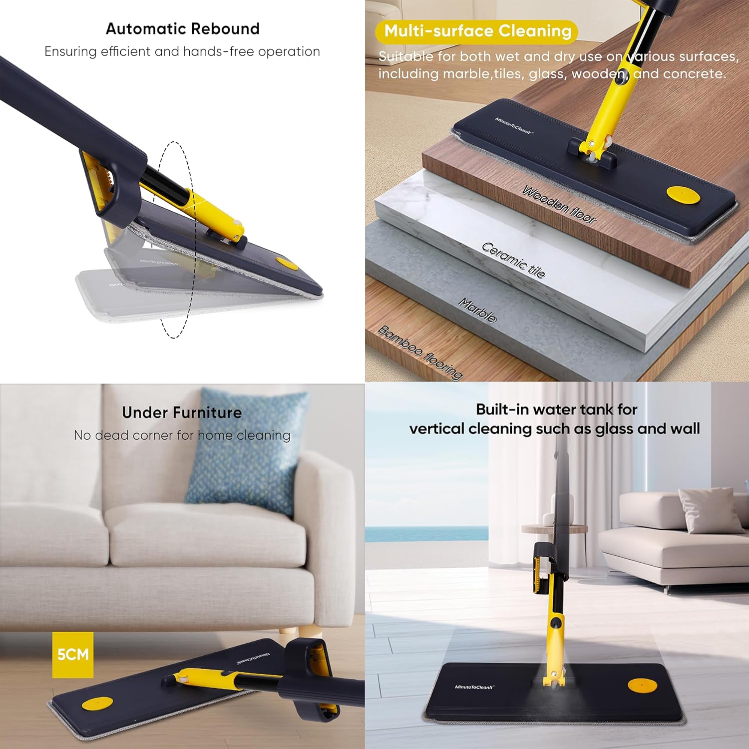 Effortless Magic Squeeze: Introducing MinuteToCleanIt easy squzze microfiber flat mop with built in spray, this mop redefines squeezing with a revolutionary push and pull design. Picture this: your mop effortlessly squeezes itself, making excess water a thing of the past. Experience the joy of hands-free squeezing, turning your cleaning routine into a delightful dance rather than a chore. This is versatile cleaning tool that combines the advantages of a water spray, squzzing and a flat mop.