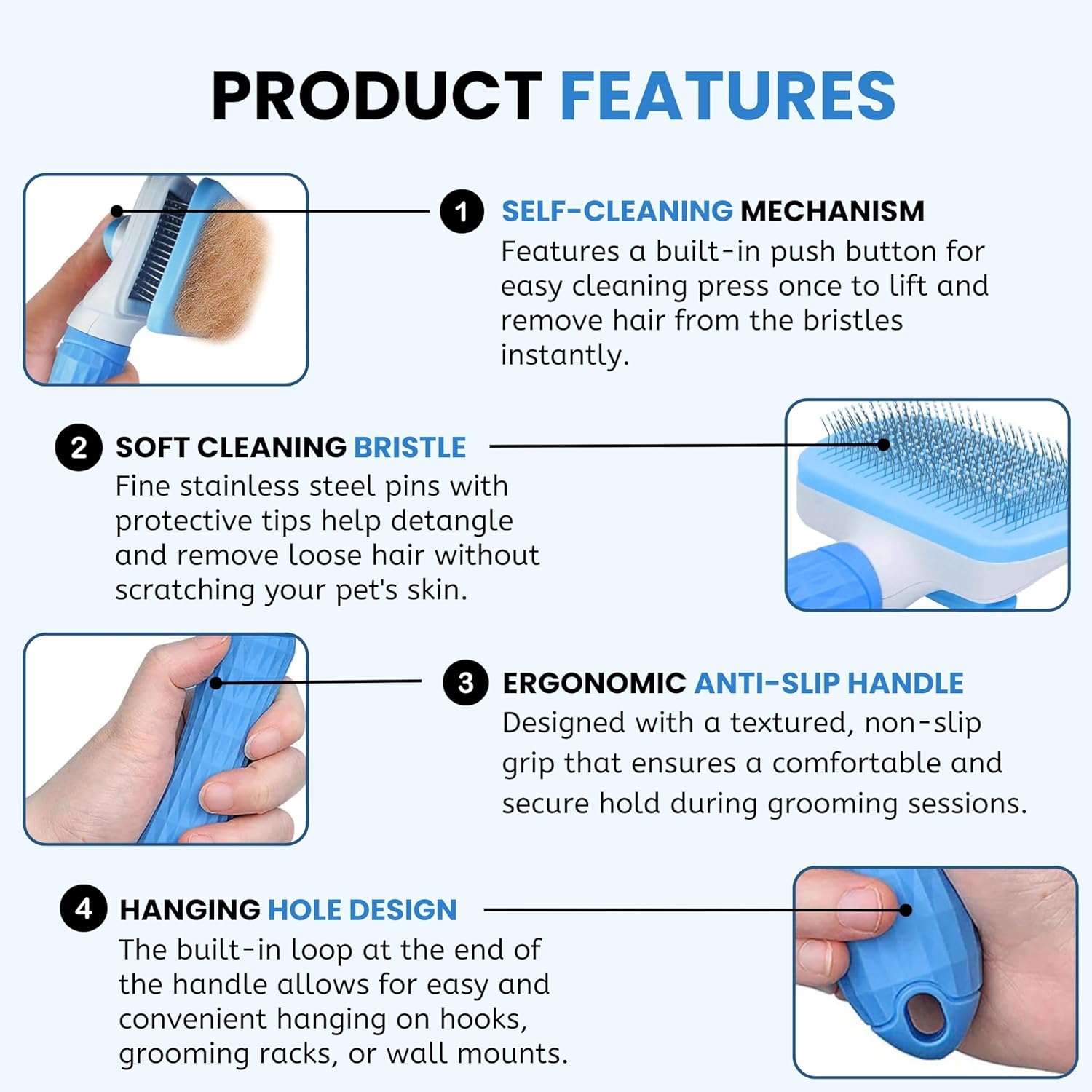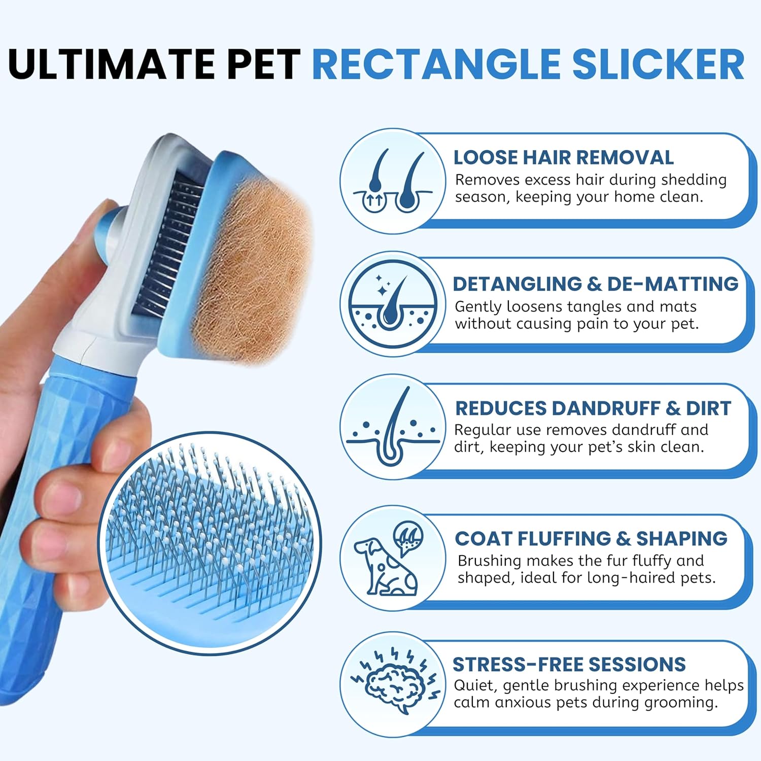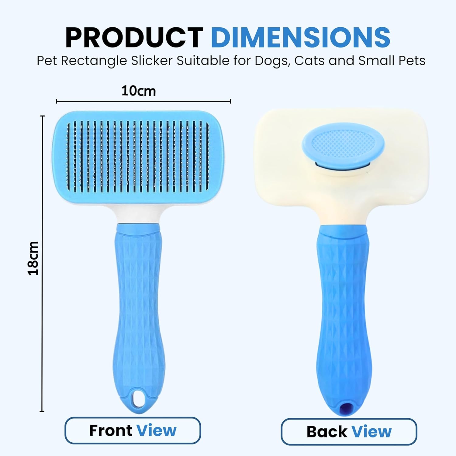 【EASY HAIR REMOVAL WITH ONE KEY】This pet grooming brush works great on dogs and cats of all sizes and short hair types. The bristle catches all the loose hair and accumulates on the base. Once you are done combing your pet, push the blue button to release the hair and wash it after every use to maintain hygiene.