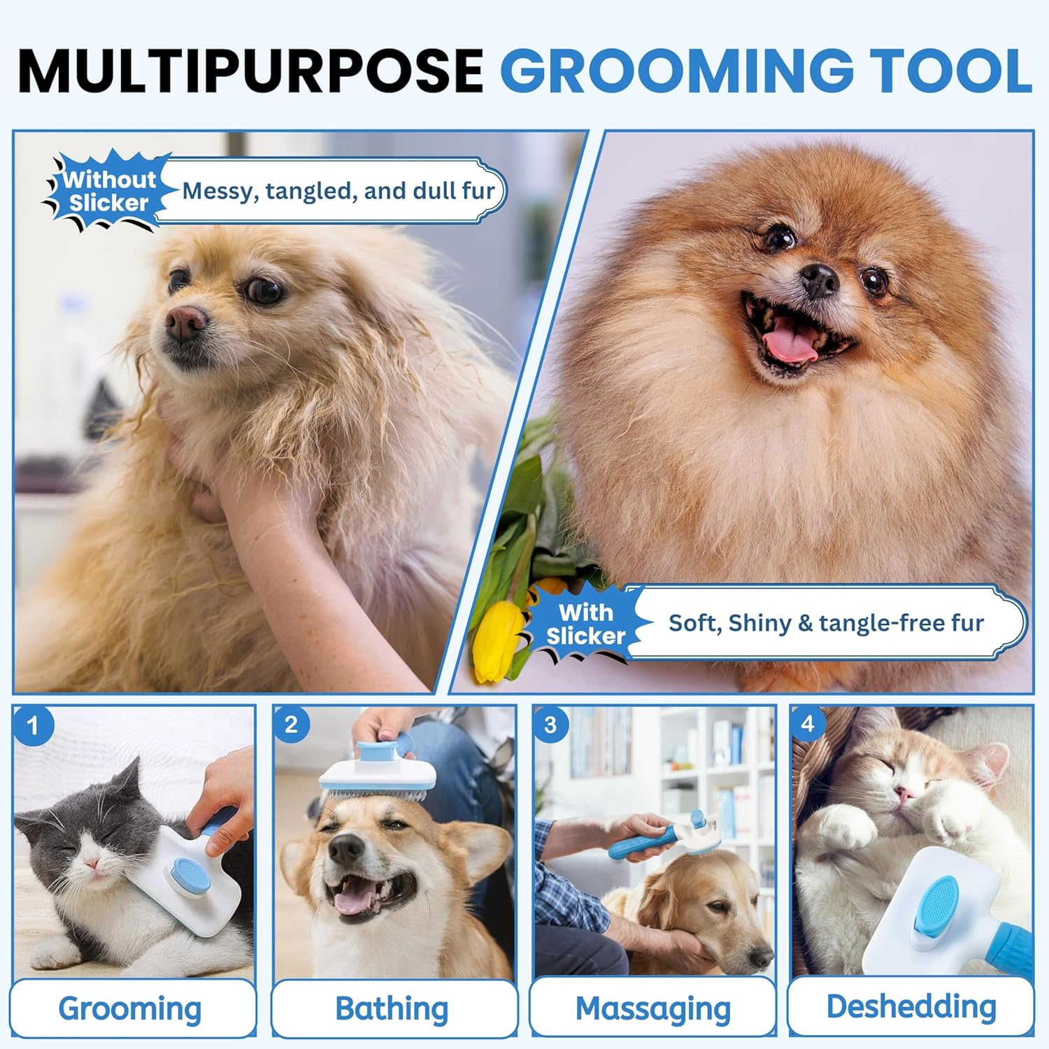 【MULTIPURPOSE, PROFESSIONAL CARE】Our waterproof pet brush can be used on wet or dry fur! It’s perfect for loosening tangles and knots, grooming, and removing dead hair. This dog comb for golden retrievers also helps prevent fur loss and improves blood circulation to keep your pet healthy, happy, clean, and active.