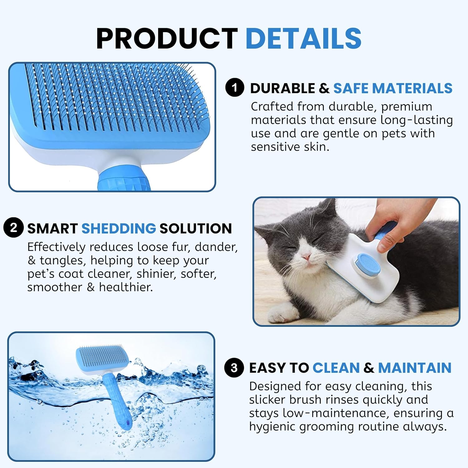【EASY HAIR REMOVAL WITH ONE KEY】This pet grooming brush works great on dogs and cats of all sizes and short hair types. The bristle catches all the loose hair and accumulates on the base. Once you are done combing your pet, push the blue button to release the hair and wash it after every use to maintain hygiene.
