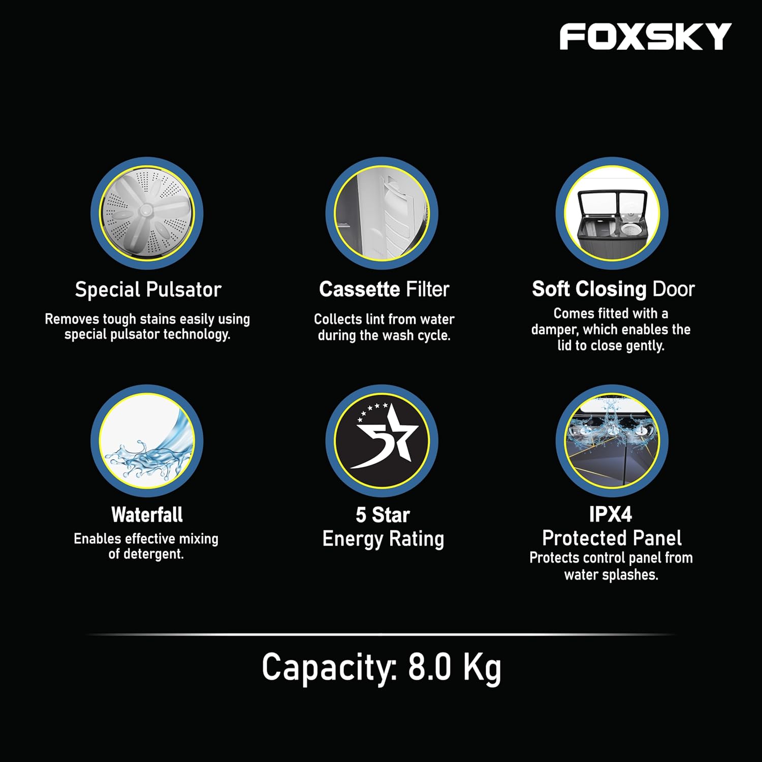 Foxsky 8.0 kg 5 Star Semi-Automatic Top Loading Washing Machine Appliance (2024 Model, Powerful Motor, Effective Wash Pulsator, 1450 RPM & Castors)