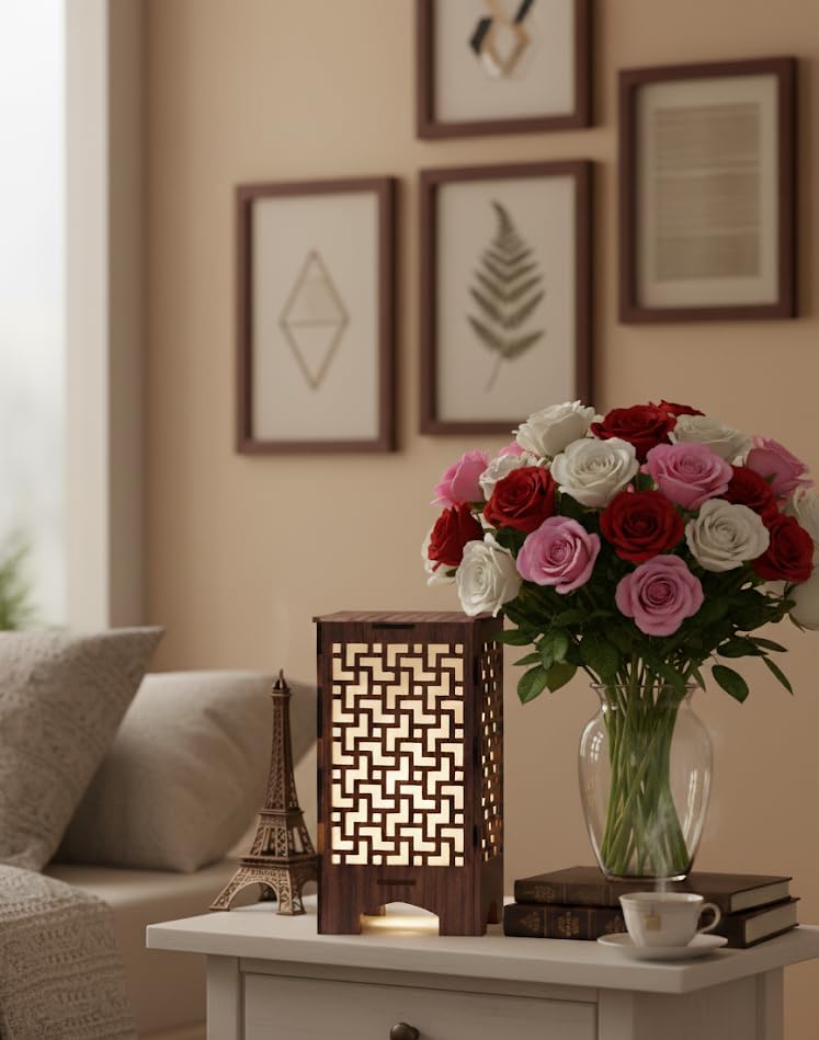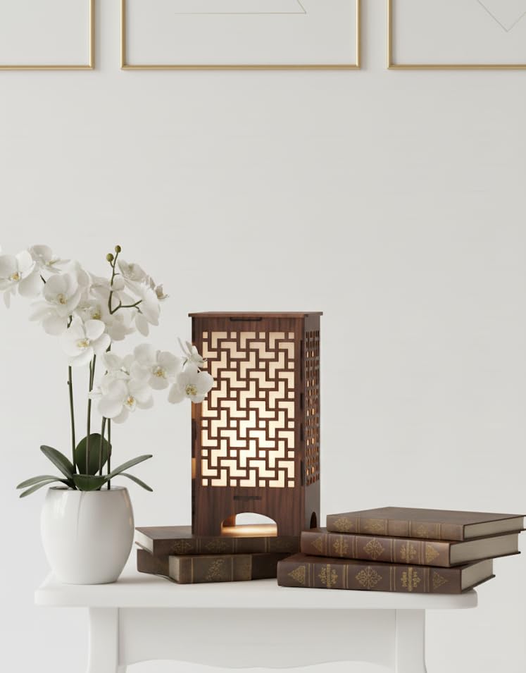 Fret Block Series Medium Wooden Table Lamp for Home Decor -11 cmX11 cmX 20 cm Table Lamp