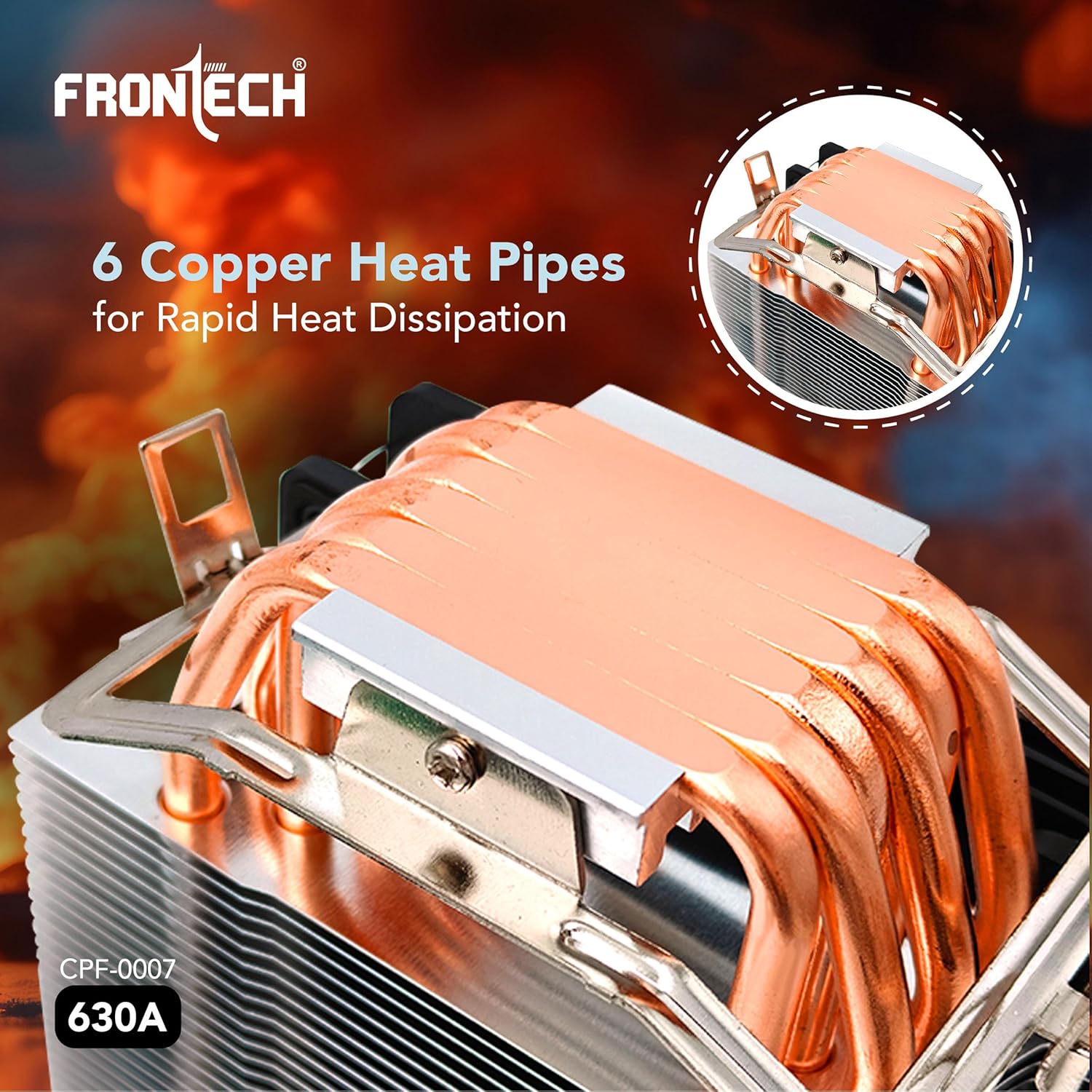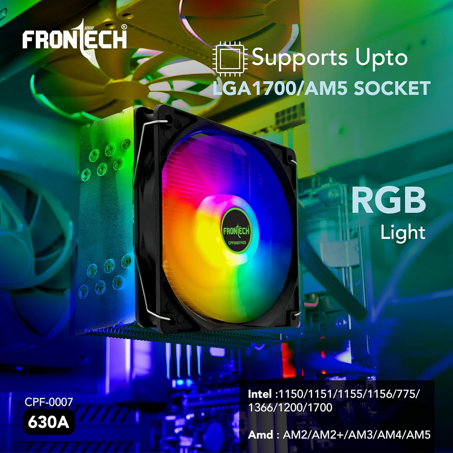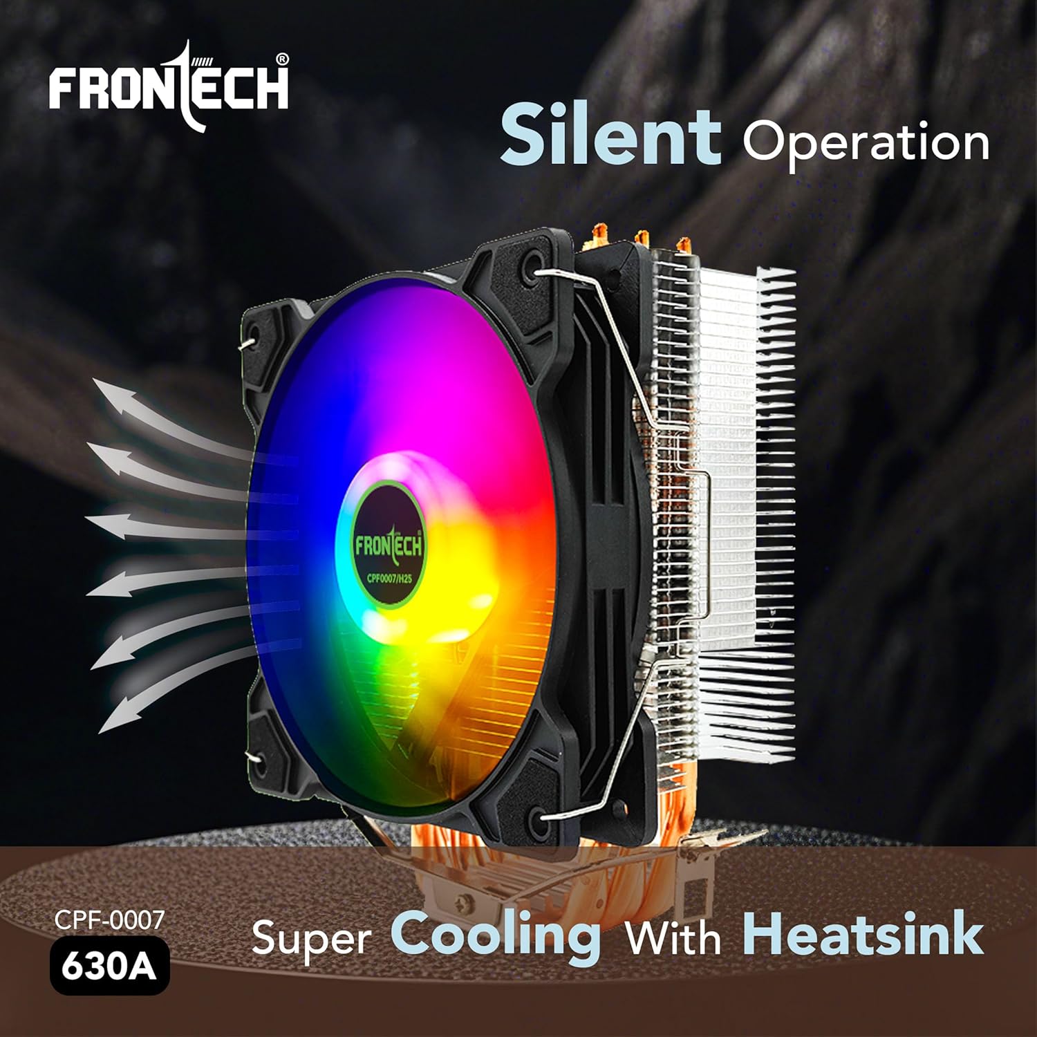 Upgrade your PC cooling performance with the Frontech CPF-0007 630A CPU Cooler, engineered for gamers, content creators, and power users. Designed with 6 high-performance copper heat pipes and a large aluminium heatsink, this cooler ensures ultra-efficient heat dissipation. The 120mm RGB fan operates silently at 1800 RPM, providing a perfect balance of cooling and aesthetics. With universal compatibility for Intel and AMD sockets—including LGA 1700 and AM5—and easy clip-on installation, it’s the perfect solution for building or upgrading your system.