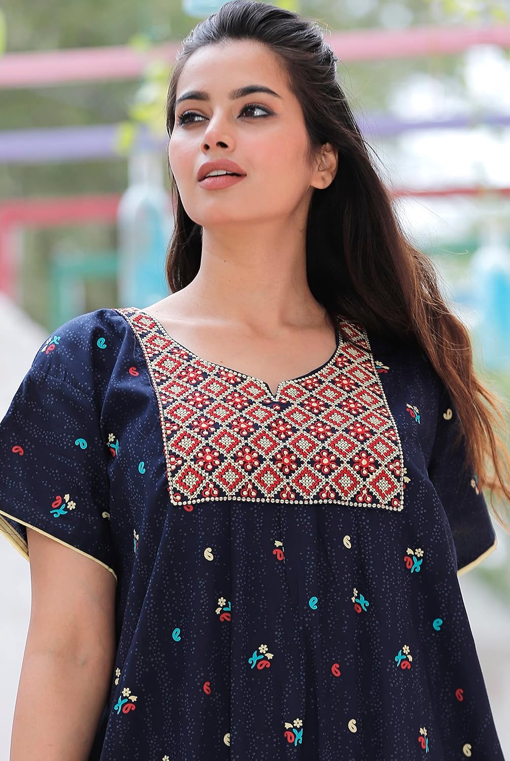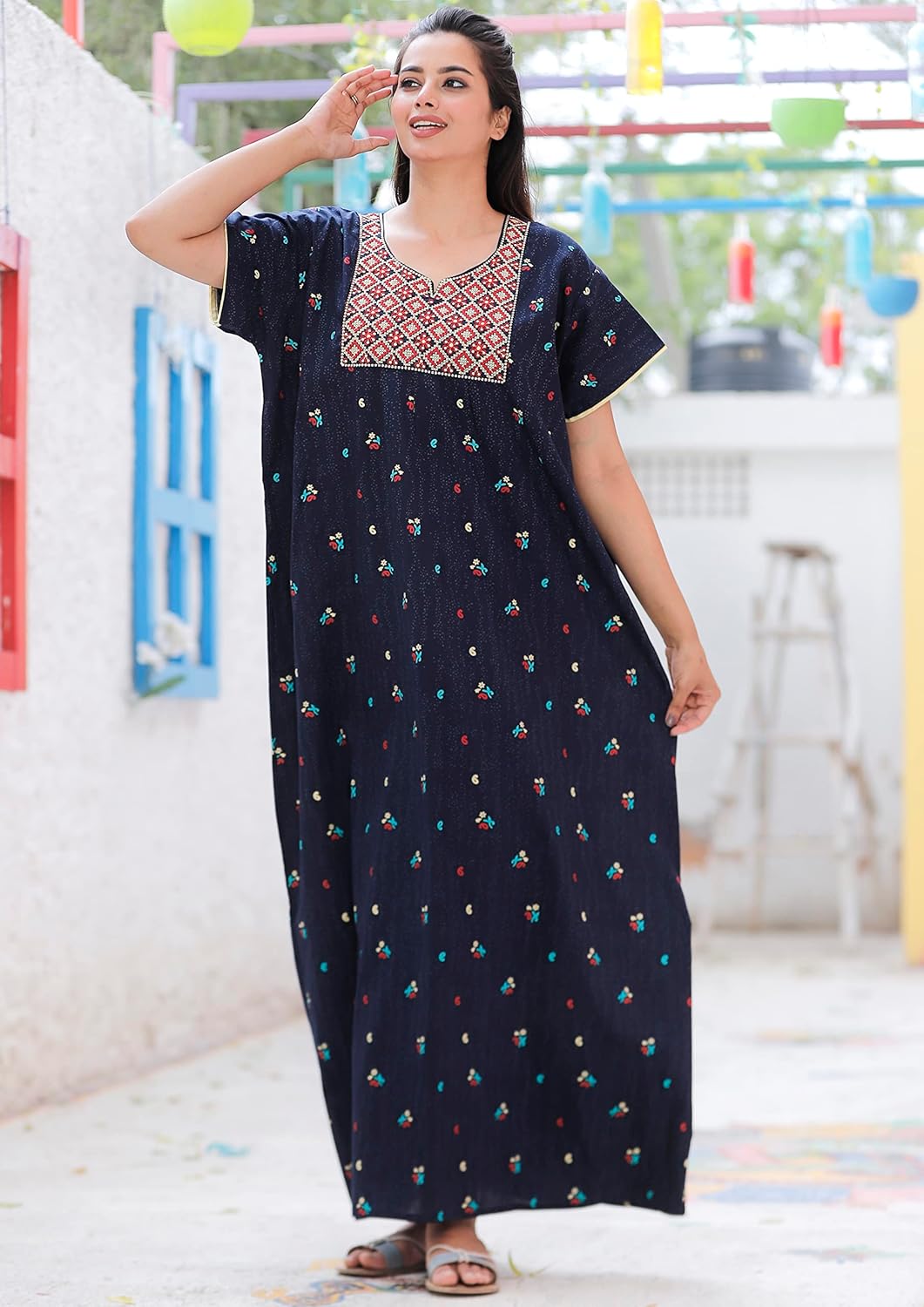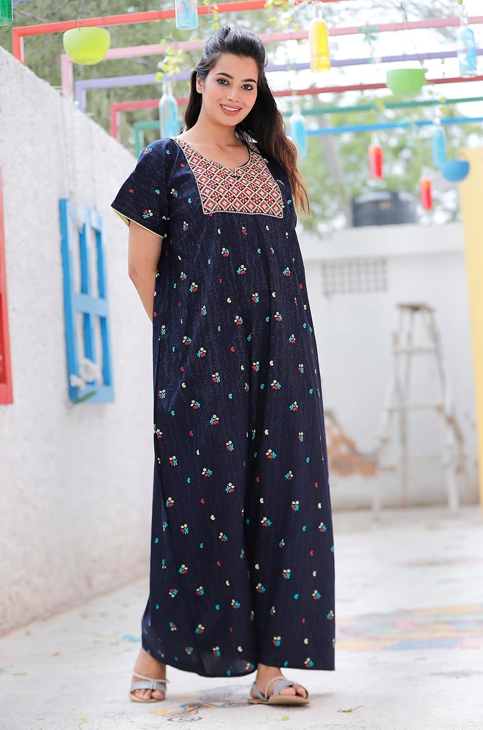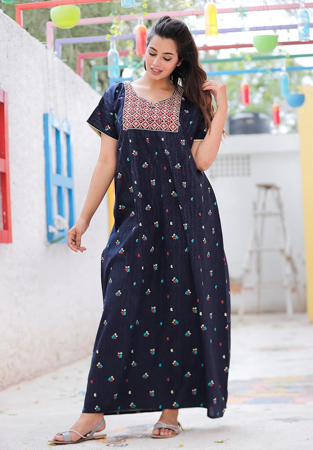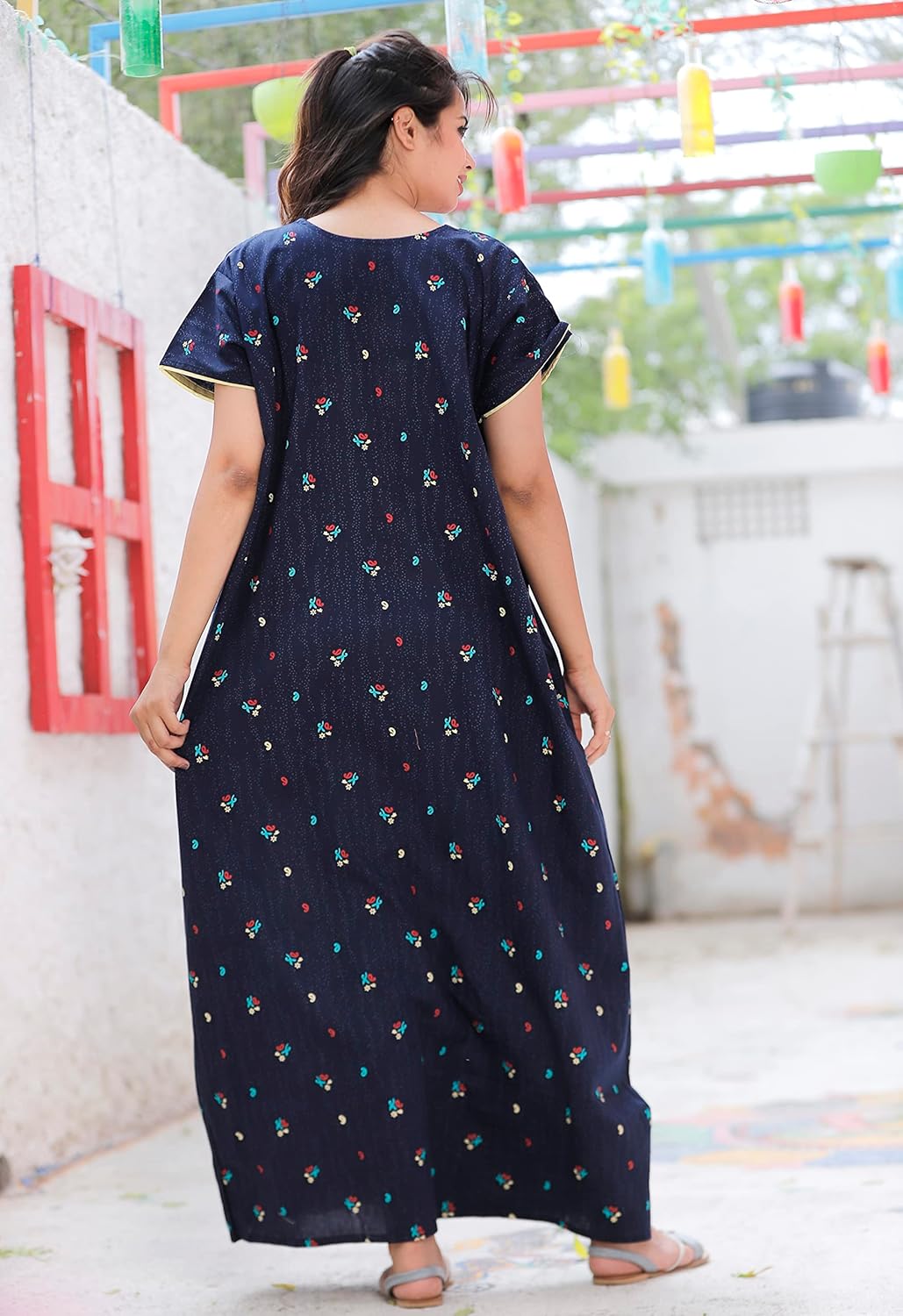 Customers find the nightgown to be of good quality, with no color bleed during washing, and one customer notes it’s made of pure cotton. The nightgown receives positive feedback for its design, comfort, and value for money. The fit is excellent, though opinions about sizing are mixed, with some finding it good while others say it’s not correct.