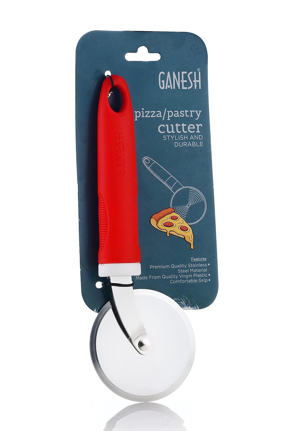 Ganesh Pizza / Pastry Cutter is made of High grade Premium Quality Stainless Steel material. Which cuts many food iteams like pastries, cakes, bread, paratha, pizza etc.The blade is bigger, slices through even the largest pizza effortlessly. Hanging Loop for Easy Storage in your Home Kitchen.